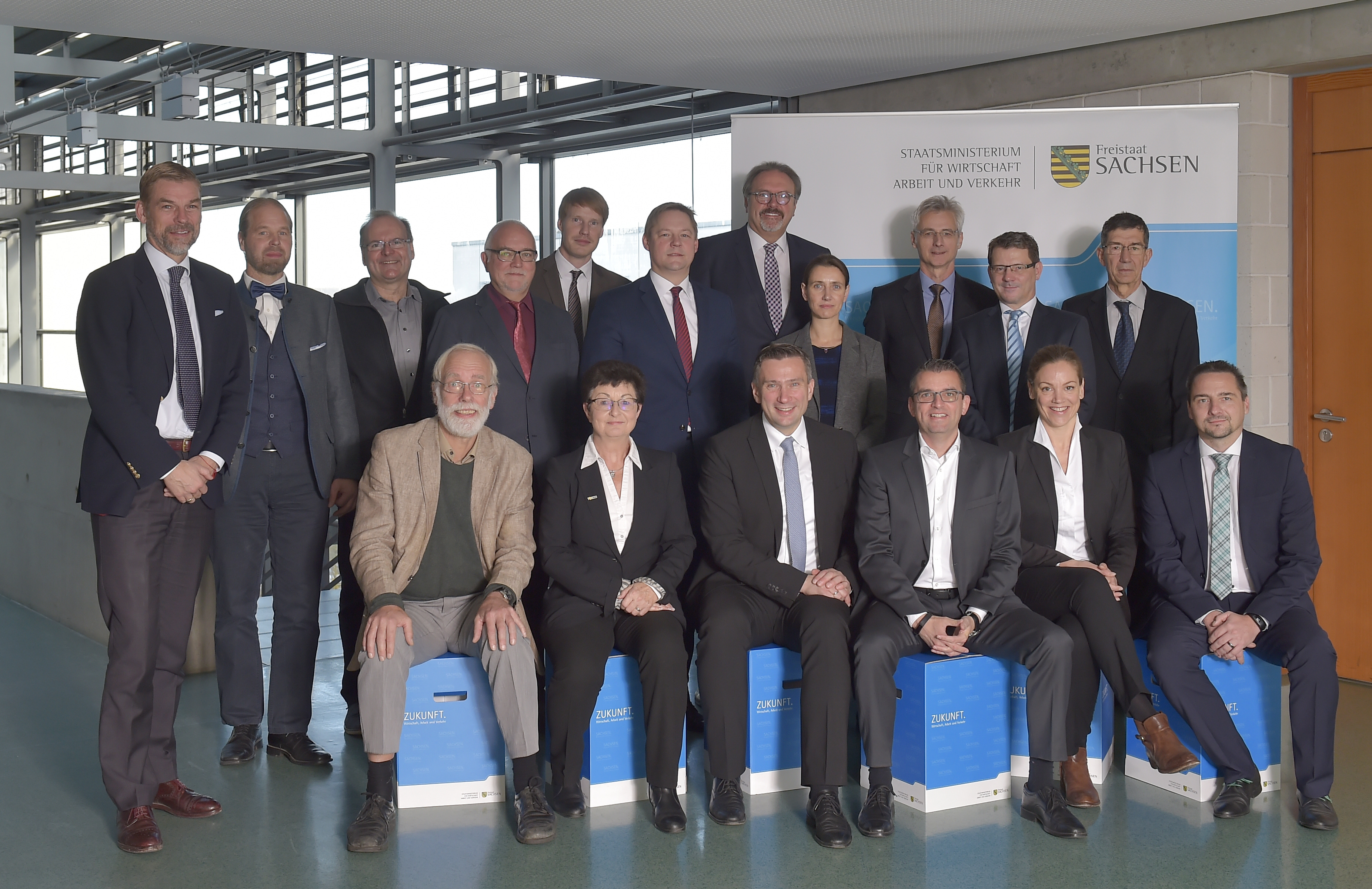 untere Reihe v.l.n.r.: Dr. Wolfgang Daniels, Ina Adler (i.V. Ralph Bahke), Wirtschaftsminister Martin Dulig, Dr. Stephan Lowis, Kerstin Maria Rippel (i.V. Boris Schucht), Jens Januszewski Obere Reihe v.l.n.r.: Bernhard Kaltefleiter, Michael Eilenberger, Professor Dr. Alexander Michaelis, Eberhard Ohm, Dr. Andreas Richter (i.V. Professor Dr.-Ing. Bernd Meyer), Mario Müller, Staatssekretär Stefan Brangs, Barbara Minderjahn, Dr. Thorsten Diercks, Thomas Füssel, Dr. Hartmut Schwarze