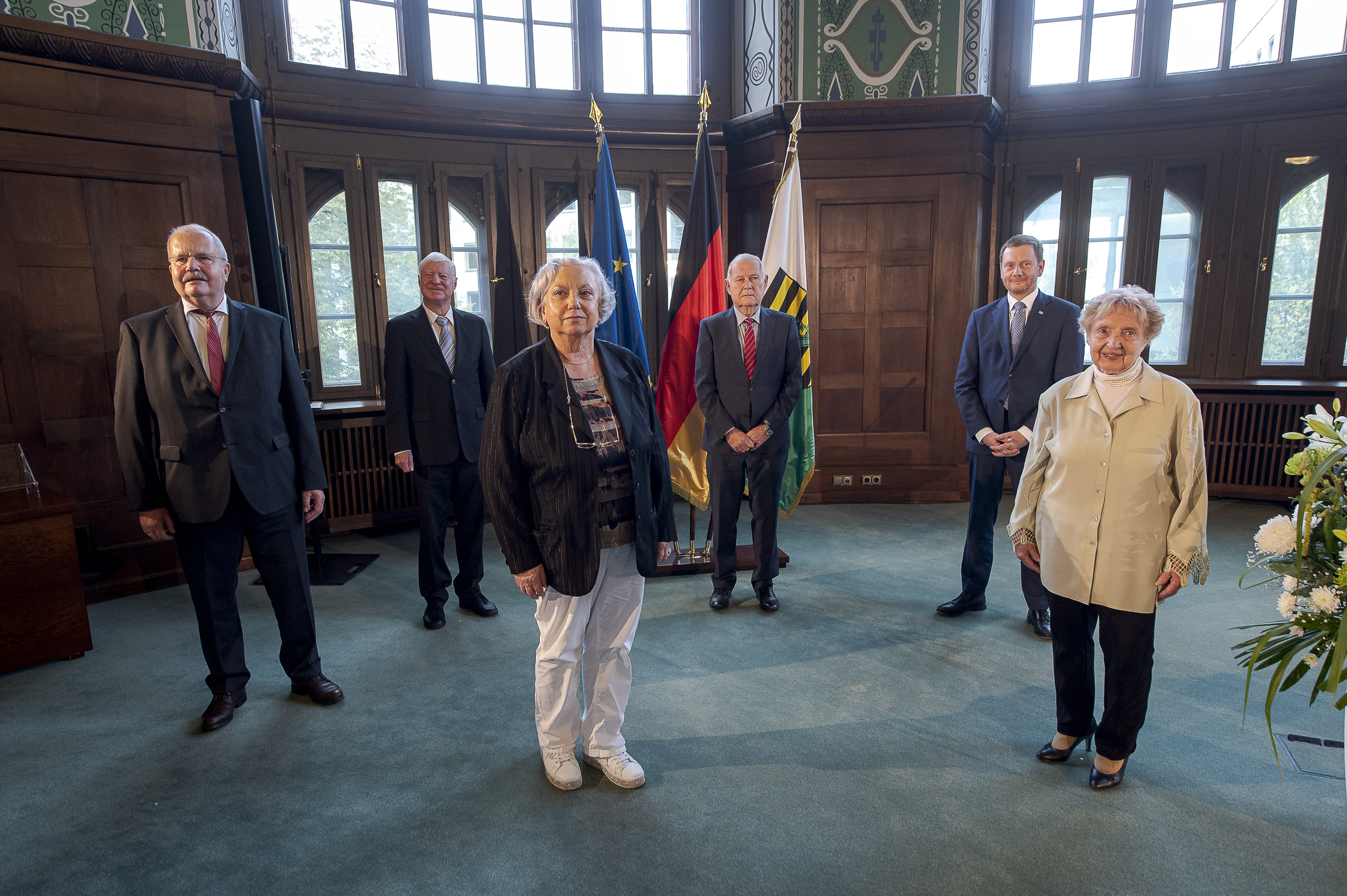 Ministerpräsident Michael Kretschmer ehrt fünf Persönlichkeiten mit dem Verdienstorden des Freistaates Sachsen; v.l. Prof. Dr. Rainer Eckert, Prof. Dr. Wolfgang Zeller, Rosemarie Schneider, Dr. Siegfried Krüger, Ministerpräsident Michael Kretschmer, Ruth Müller-Landauer