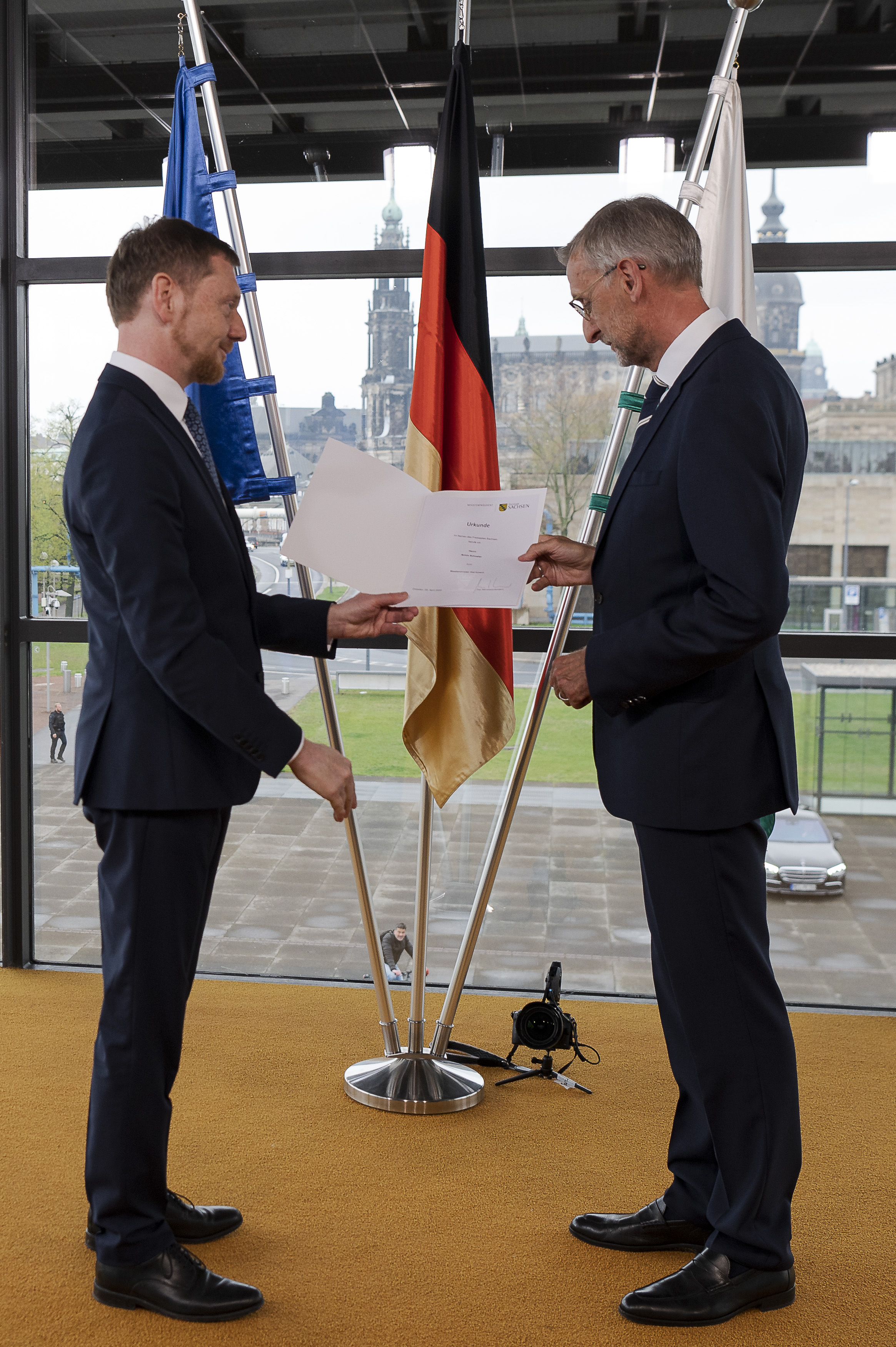 Ministerpräsident Michael Kretschmer hat Armin Schuster zum neuen Innenminister von Sachsen berufen und ihm die Berufungsurkunde überreicht.