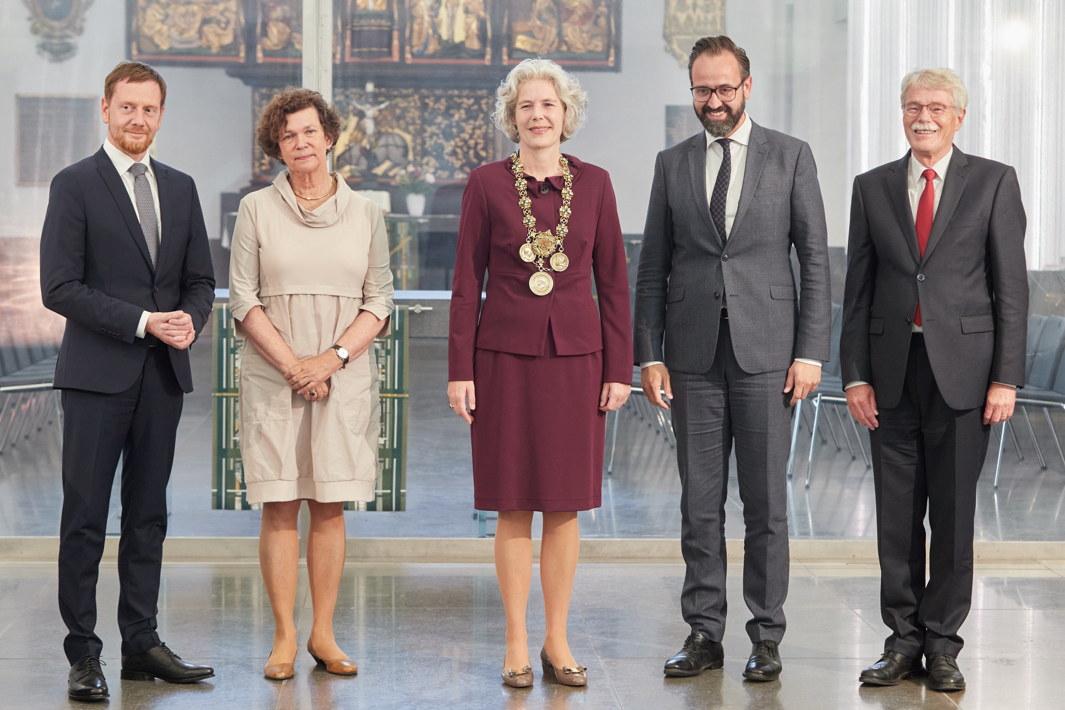 V.l.n.r.: Ministerpräsident Michael Kretschmer, Altrektorin Prof. Dr. Beate Schücking, Rektorin Prof. Dr. Eva Inés Obergfell, Wissenschaftsminister Sebastian Gemkow, Dr. Hans-Gerhard Husung, Vorsitzender des Hochschulrats