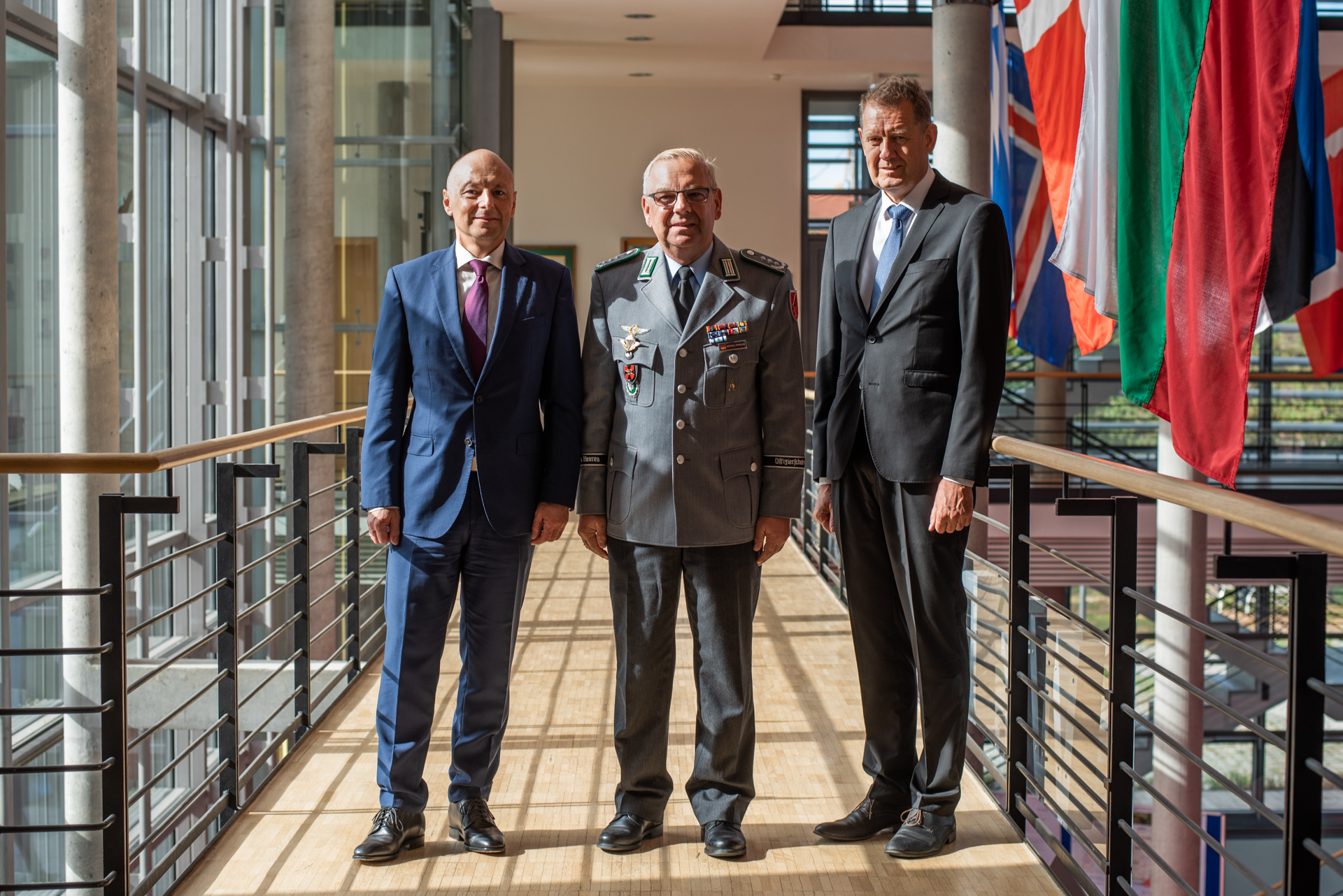 Begrüßten und vereidigten die neuen Anwärterinnen und Anwärter der Finanz- und Steuerverwaltung: (v.r.n.l.) Dirk Diedrichs, Amtschef im Sächsischen Staatsministerium der Finanzen, Oberst Popielas und Jürgen Kirst, Vizepräsident des Landesamtes für Steuern und Finanzen.