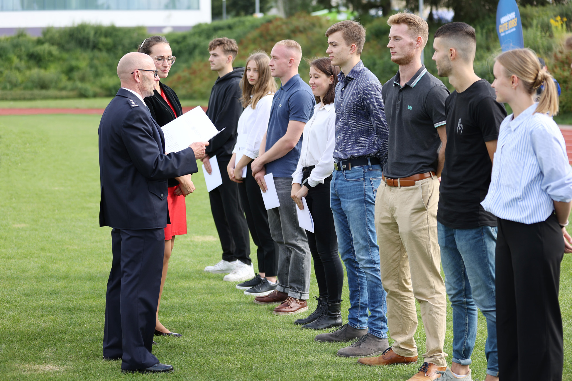 Polizeihauptkommissar Mario Eigler, kommissarischer Leiter der Polizeifachschule Schneeberg, ernennt Auszubildende zum Beamten auf Widerruf