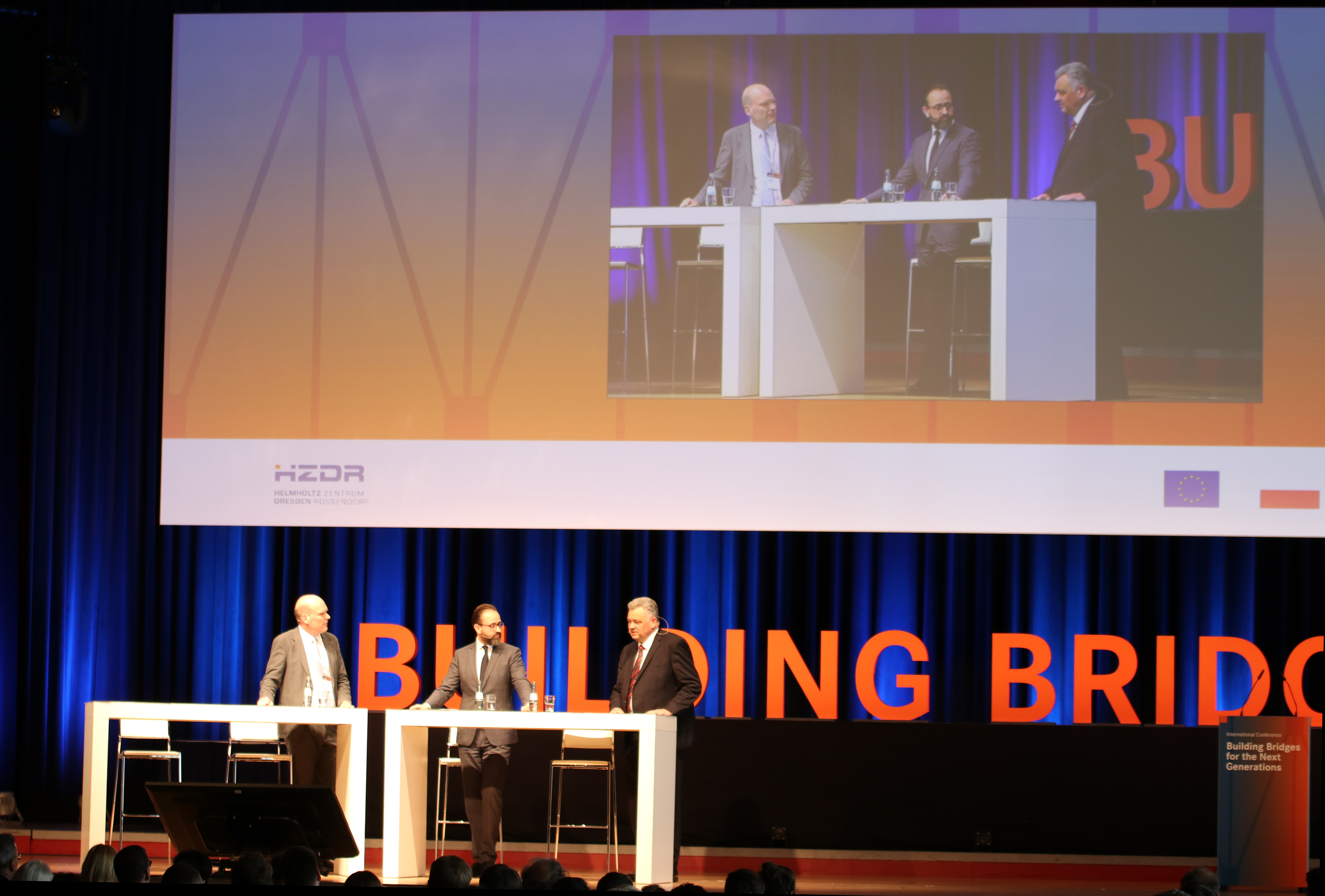 Sachsens Wissenschaftsminister Sebastian Gemkow (Mitte) hat am Mittag die internationale Wissenschaftskonferenz »Building Bridges for the Next Generations« im internationalen Kongresszentrum in Dresden eröffnet. Links Moderator Jan-Martin Wiarda neben Prof. Dr. Sebastian M. Schmidt, Vorstand Helmholtz-Zentrum Dresden-Rossendorf.