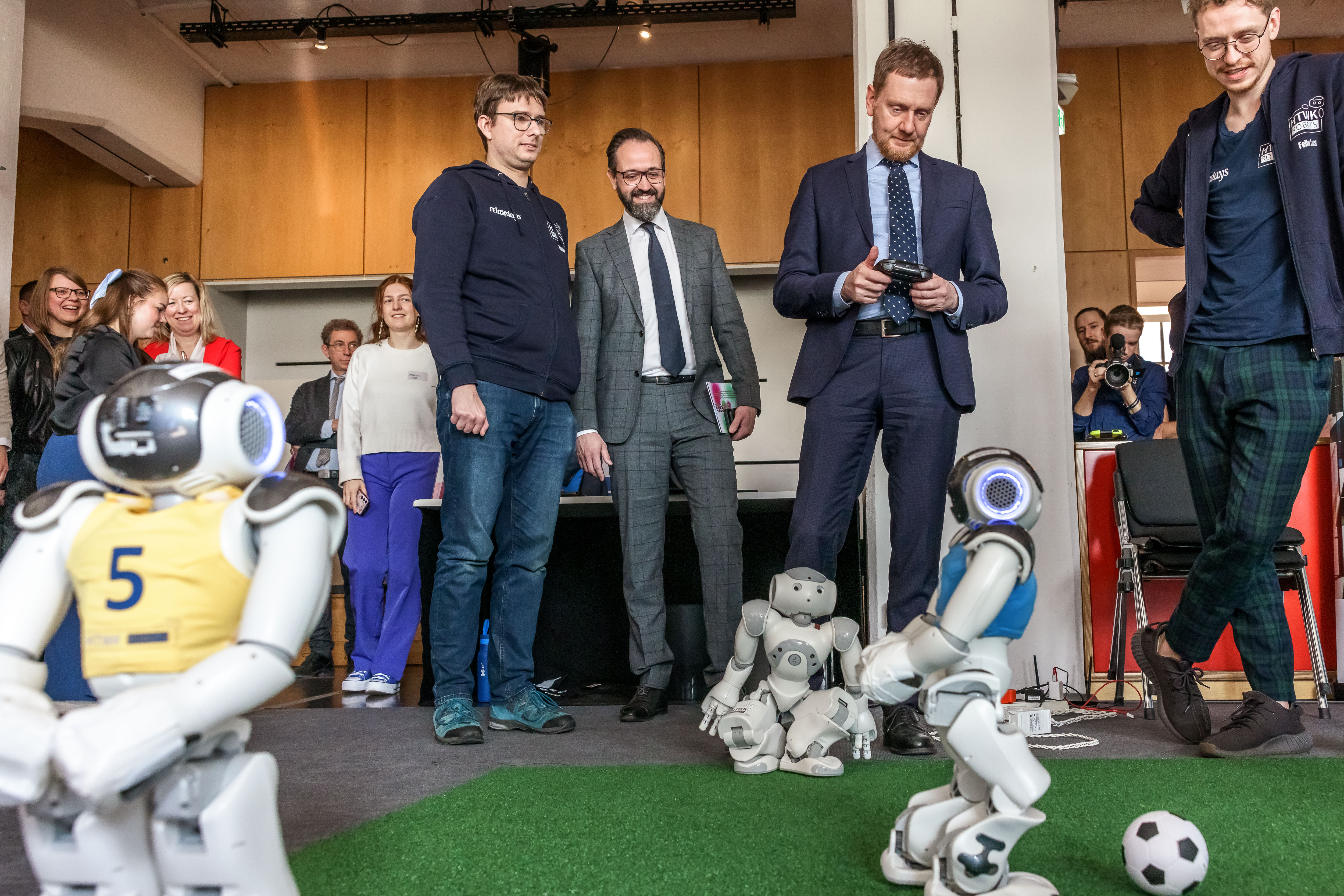 Ministerpräsident Kretscher und Wissenschaftsminister Gemkow besuchen den Stand der Fußballroboter der HTWK Leipzig