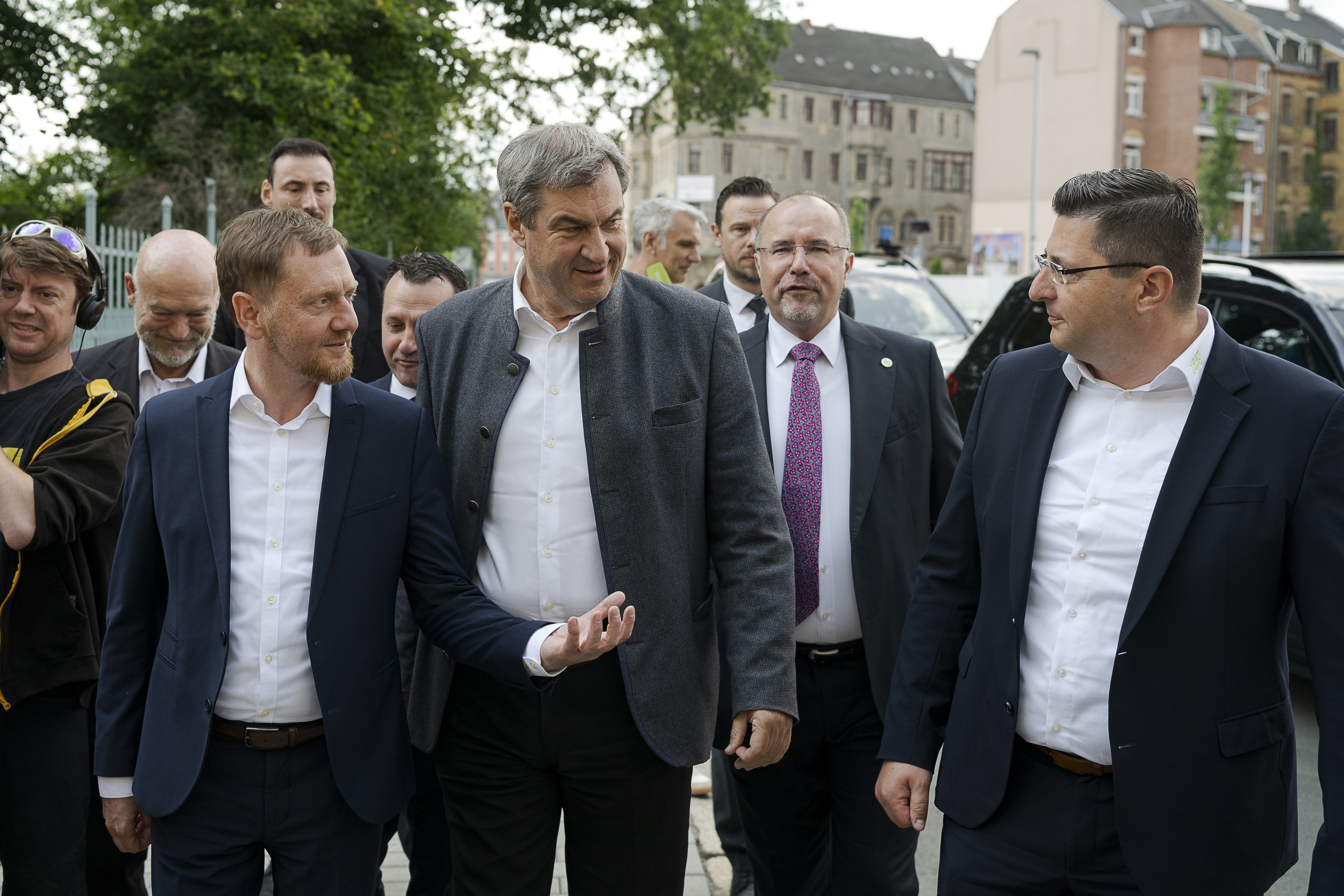 Ministerpräsident Michael Kretschmer und Ministerpräsident Markus Söder besuchen gemeinsam die Stadt Plauen. Begrüßung von Ministerpräsident Dr. Markus Söder vor dem Museum „Fabrik der Fäden“ – gemeinsam mit Landrat Hennig, Oberbürgermeister Zenner sowie Museums-Direktor Dressel.