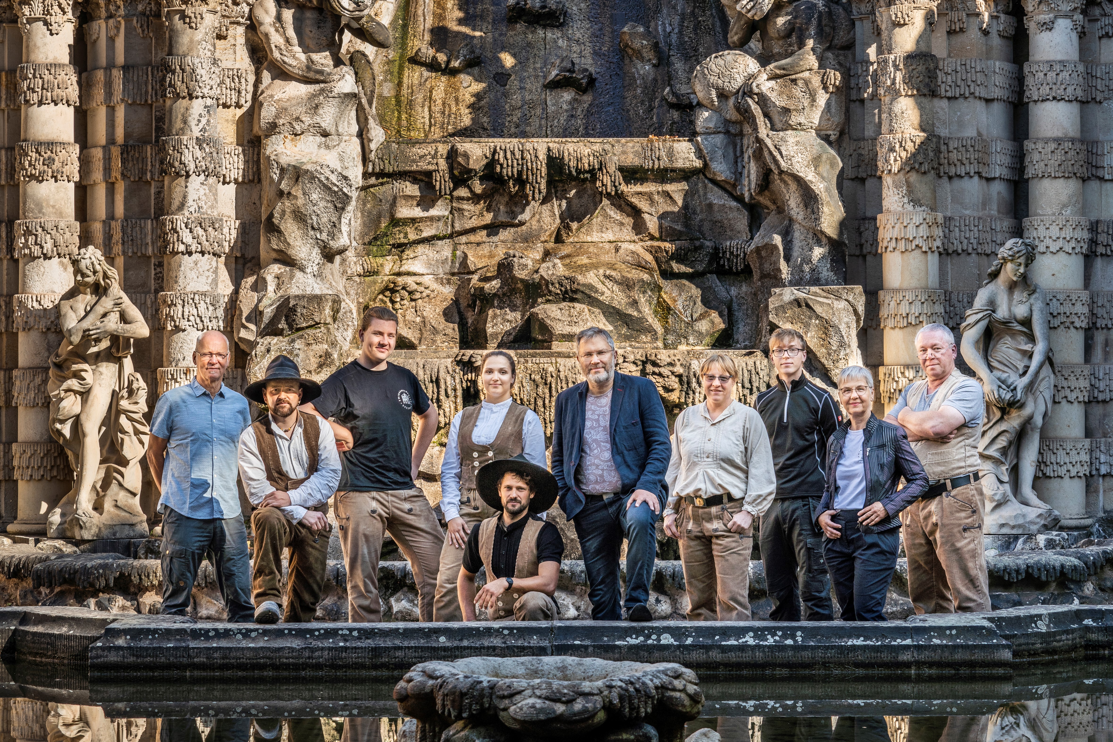 Foto: Das Team der Zwingerbauhütte im Jahr 2024 unter der Leitung von Zwingerbaumeister Kai-Uwe Beger (Mitte).