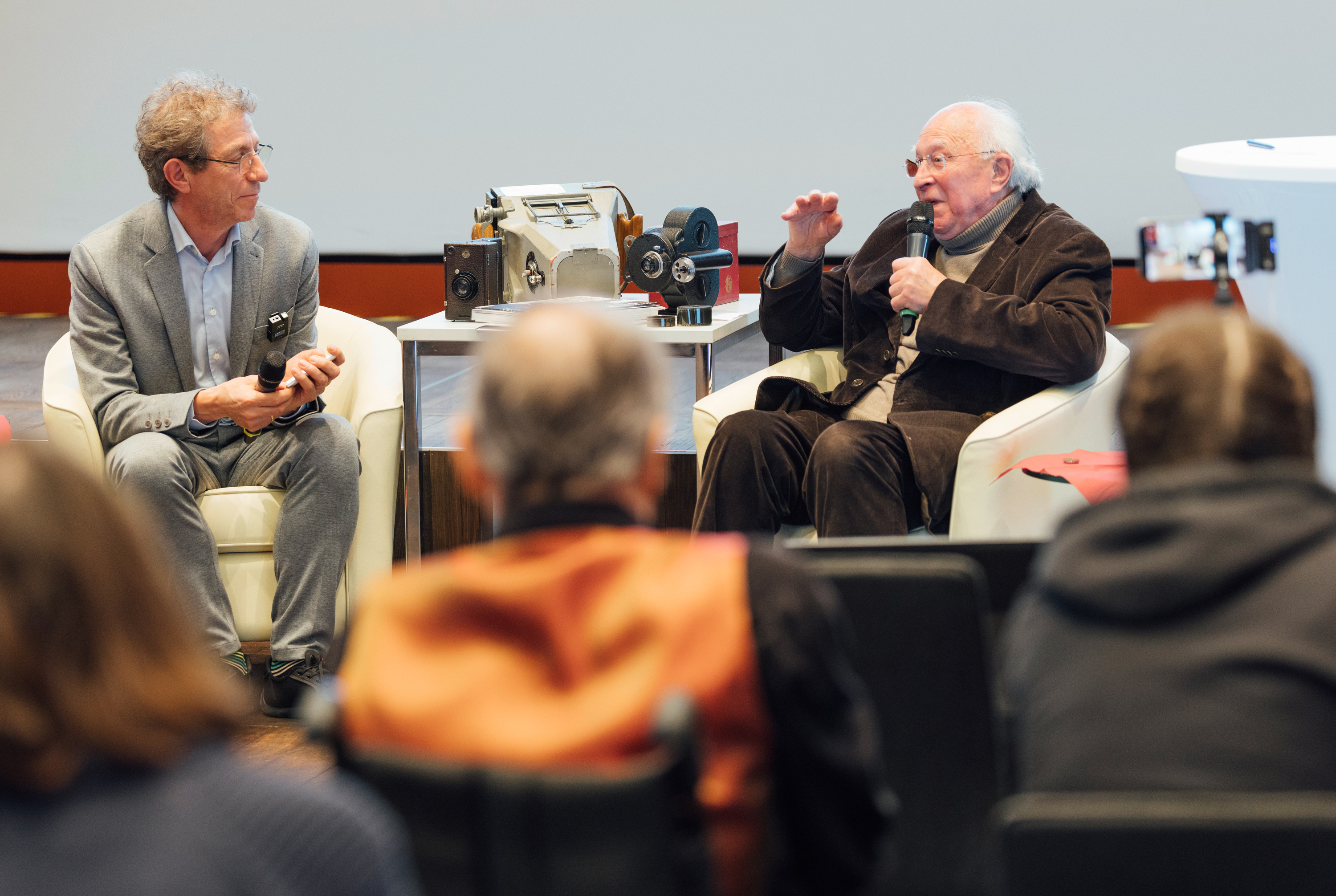 Roland Schwarz (links) und Ernst Hirsch (rechts) im Gespräch über Leben und Werk zur Pressekonferenz anlässlich der Sammlungsübernahme am 26.3.2025 in der SLUB. (© Oliver Killig)