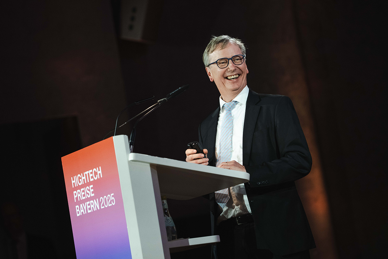 Prof. Gerhard Fettweis steht nach seiner Auszeichnung freudig am Rednerpult der Gala zur Verleihung der HighTech-Preise Bayern 2025