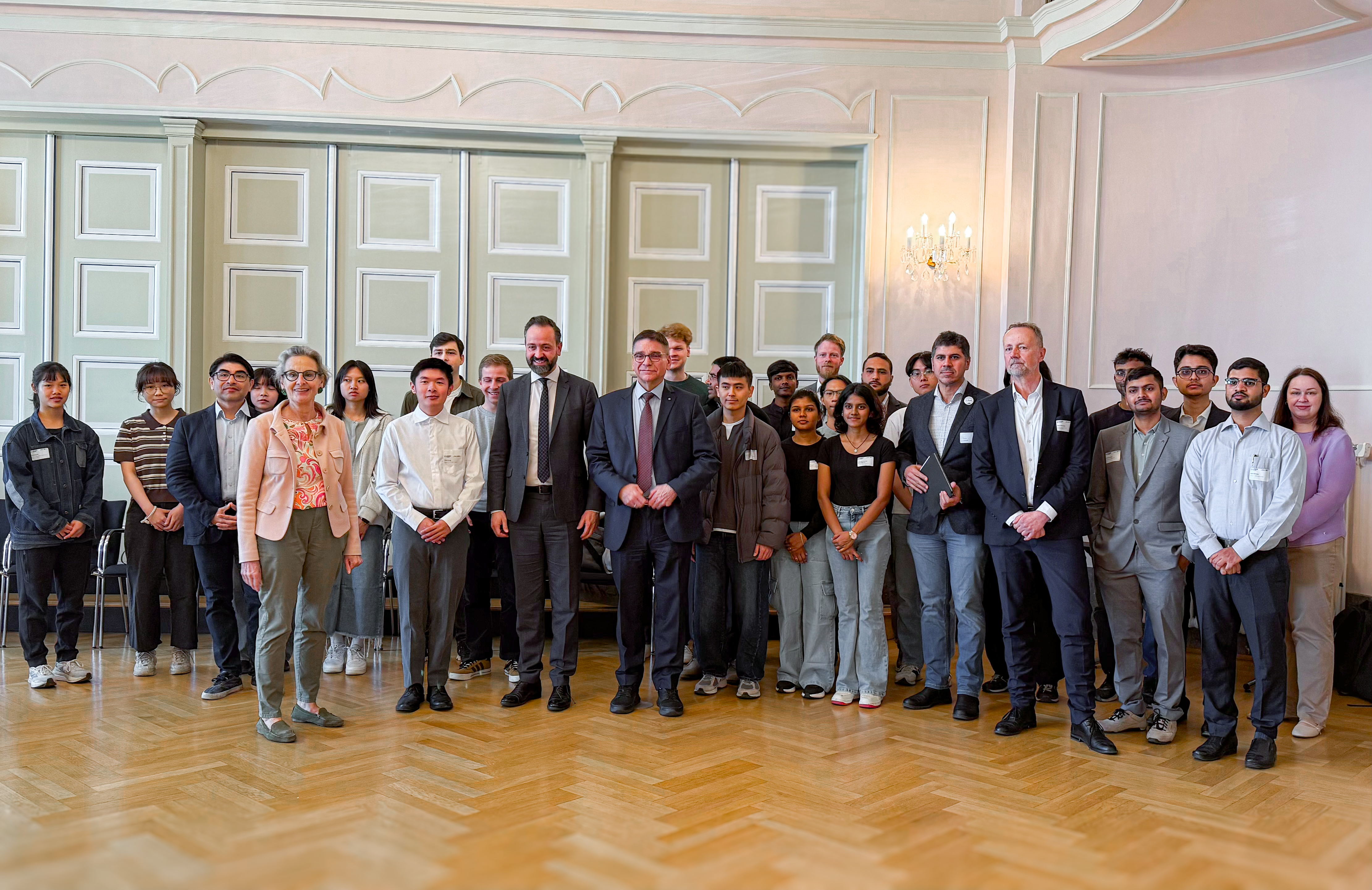 Gruppenbild der Teilnehmer am Meet&Greet an der TU Dresden mit (u.a. mit Rektorin Ursula M. Staudinger Wissenschaftsminister Sebastian Gemkow)