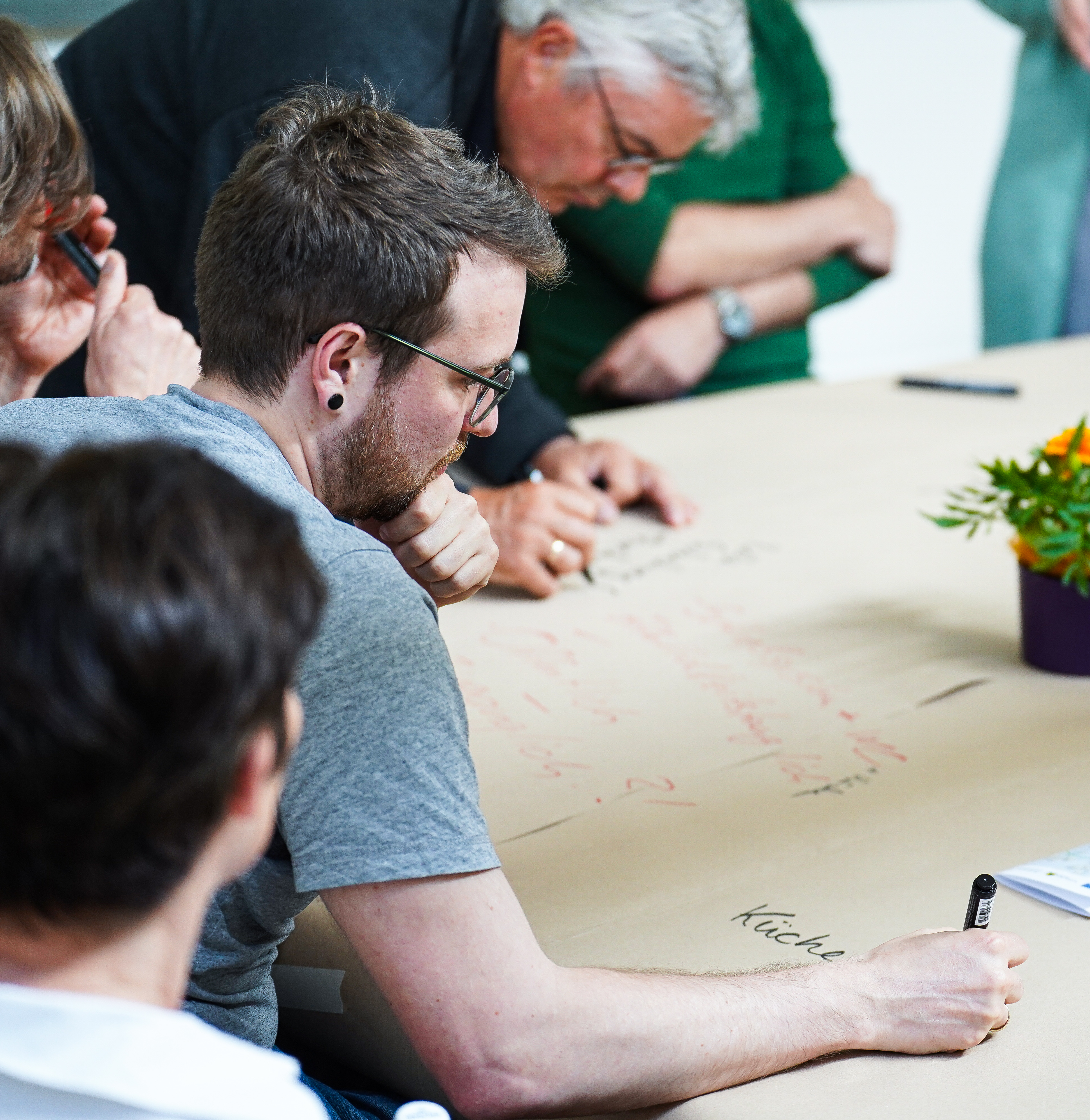 Teilnehmer eines Workshops notieren ihre Ideen und Gedanken auf ein großes Pergament auf einem der Diskussionstische.