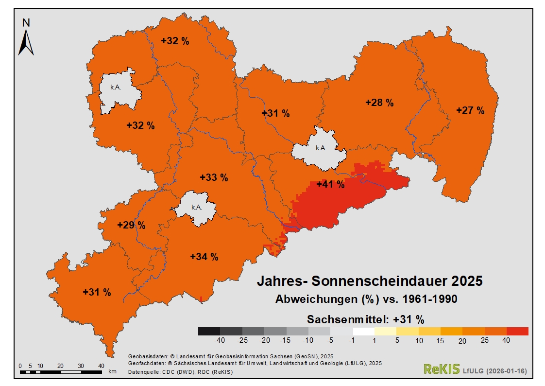 Sonnenscheindauer 2025 (Abweichungen im Vergleich zur Referenzperiode 1961-1990) (© LfULG)
