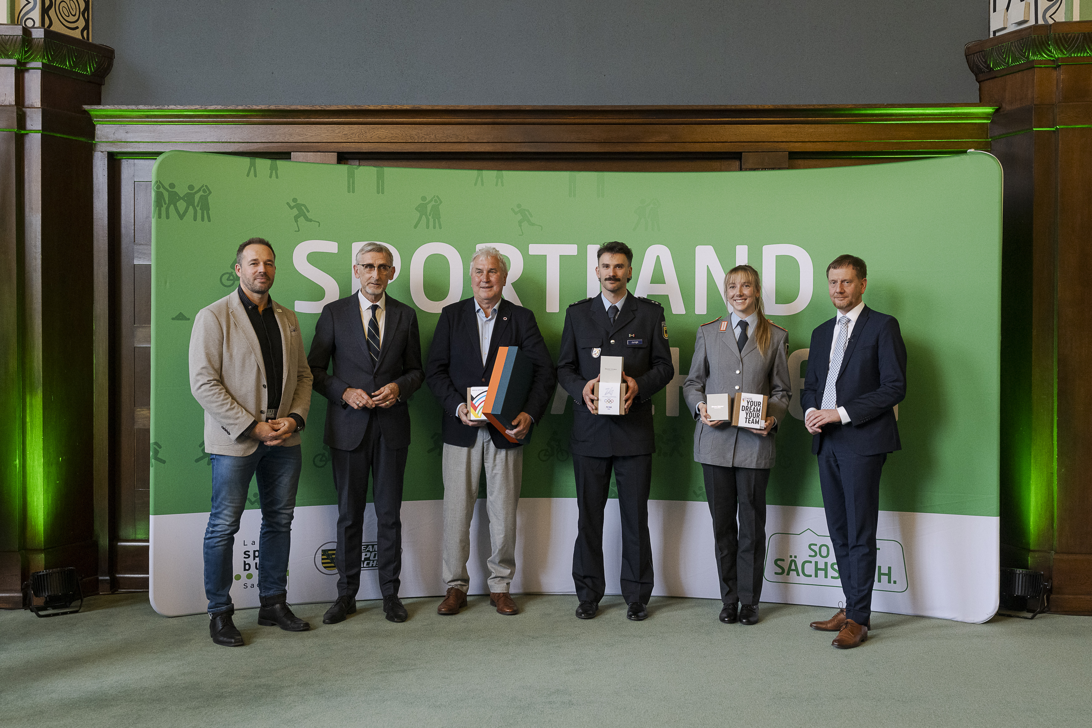 Ehrung von Axel Jungk, Susanne Kreher & Trainer: Stefan Poser durch Ministerpräsident Kretschmer, Staatsminister Schuster und Christian Pöhler (Leiter Olympiastützpunkt).