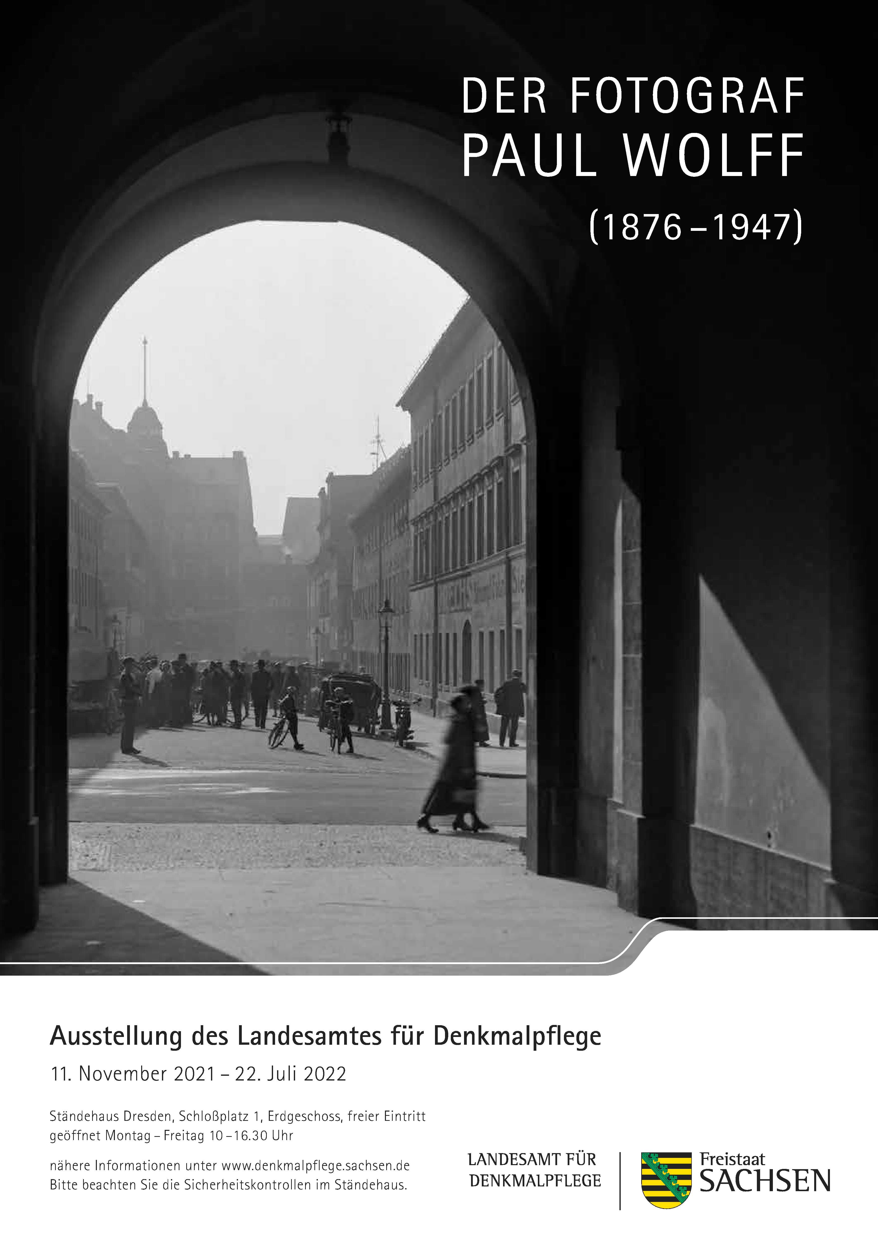 Die Ausstellung widmet sich dem Fotografen Paul Wolff (1876-1947). Sein Nachlass ist der umfangreichste und bedeutendste Fundus der Bildsammlung des LfD. Mit über 100 repräsentativen Aufnahmen wird der Fotograf oder »Lichtbildner«, wie er sich selbst bezeichnete, vorgestellt. Sein Hauptinteresse lag vor allem in seiner sich durch die moderne Technik rasant ändernden Umwelt: Er erfasste historische Stadtbilder und das Land, seltener porträtierte er Menschen. Bisher kaum gezeigte Aufnahmen zwischen 1910 und 1930er Jahren unter anderem von Chemnitz, Leipzig, Dresden, Freital, Moritzburg und Berggießhübel werden in großformatigen Bildern präsentiert. Ergänzt wird die Ausstellung durch Bücher, originale Abzüge des Fotografen und Schriftstücke aus dem Nachlass. Der noch wenig bekannte Fotograf aus Dresden war sehr erfolgreich, wie die über 70 bekannten Fotobildbände, Prospekte und Postkarten aus seiner Schaffenszeit belegen. Zeitweise war Paul Wolff der einzige selbstständige Fotograf, der in den Räumen im Dresdner Residenzschloss fotografieren durfte. Wolffs Fotografien dienen bis heute als wichtige Grundlage unter anderem bei der Wiederherstellung des historischen Grünen Gewölbes Dresden, im Schloss Moritzburg bei der Identifizierung von Kunstgegenständen und bei der Wiederherstellung des Lahmann-Sanatoriums Dresden.