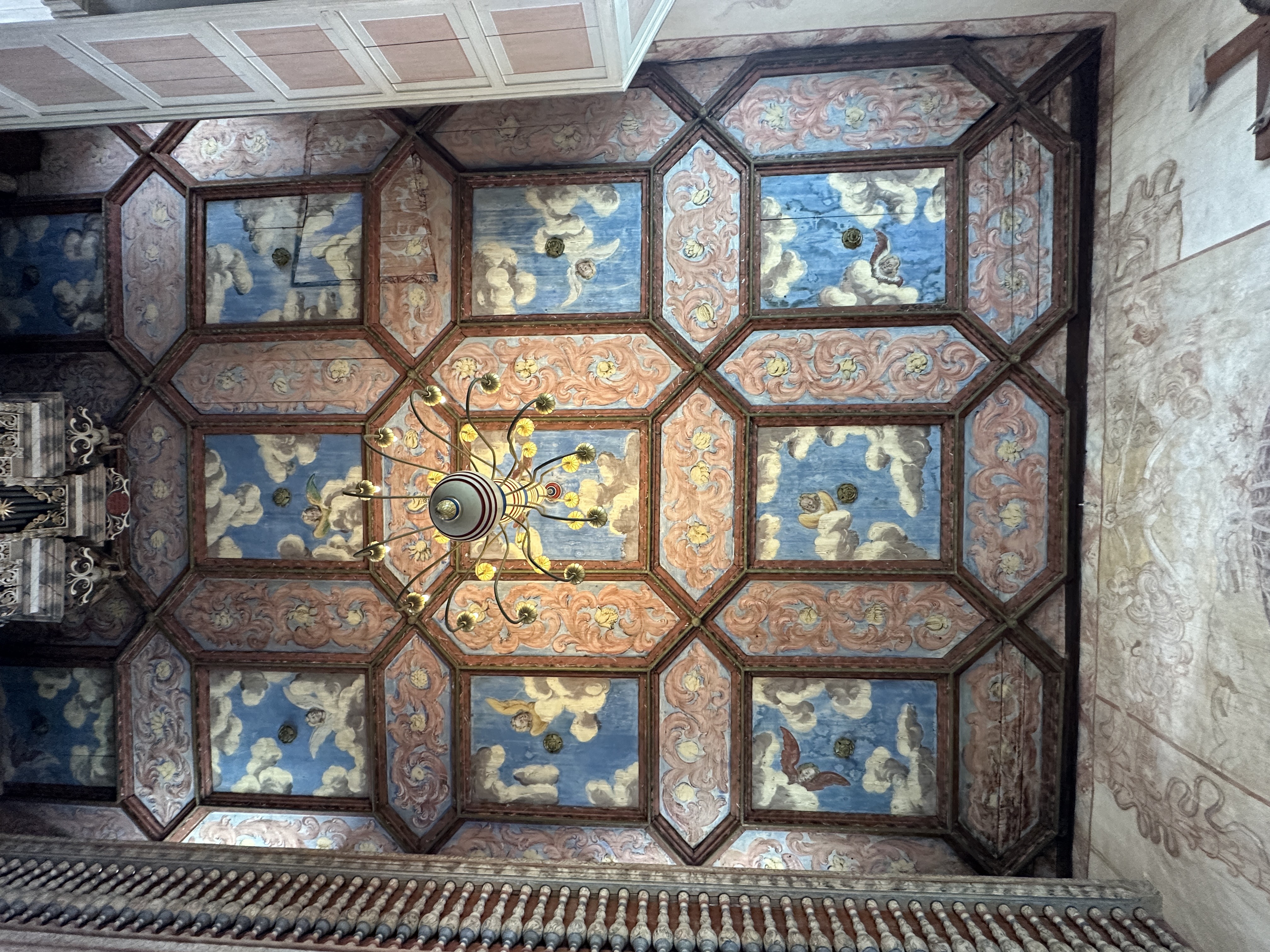 - [Foto] Ostrau, Kirche Kiebitz, kassettierte Holzbalkendecke mit bemalten Feldern, 1673/73 mit installierter Messeinheit direkt unter der Decke zur Erfassung bauklimatischer Daten.