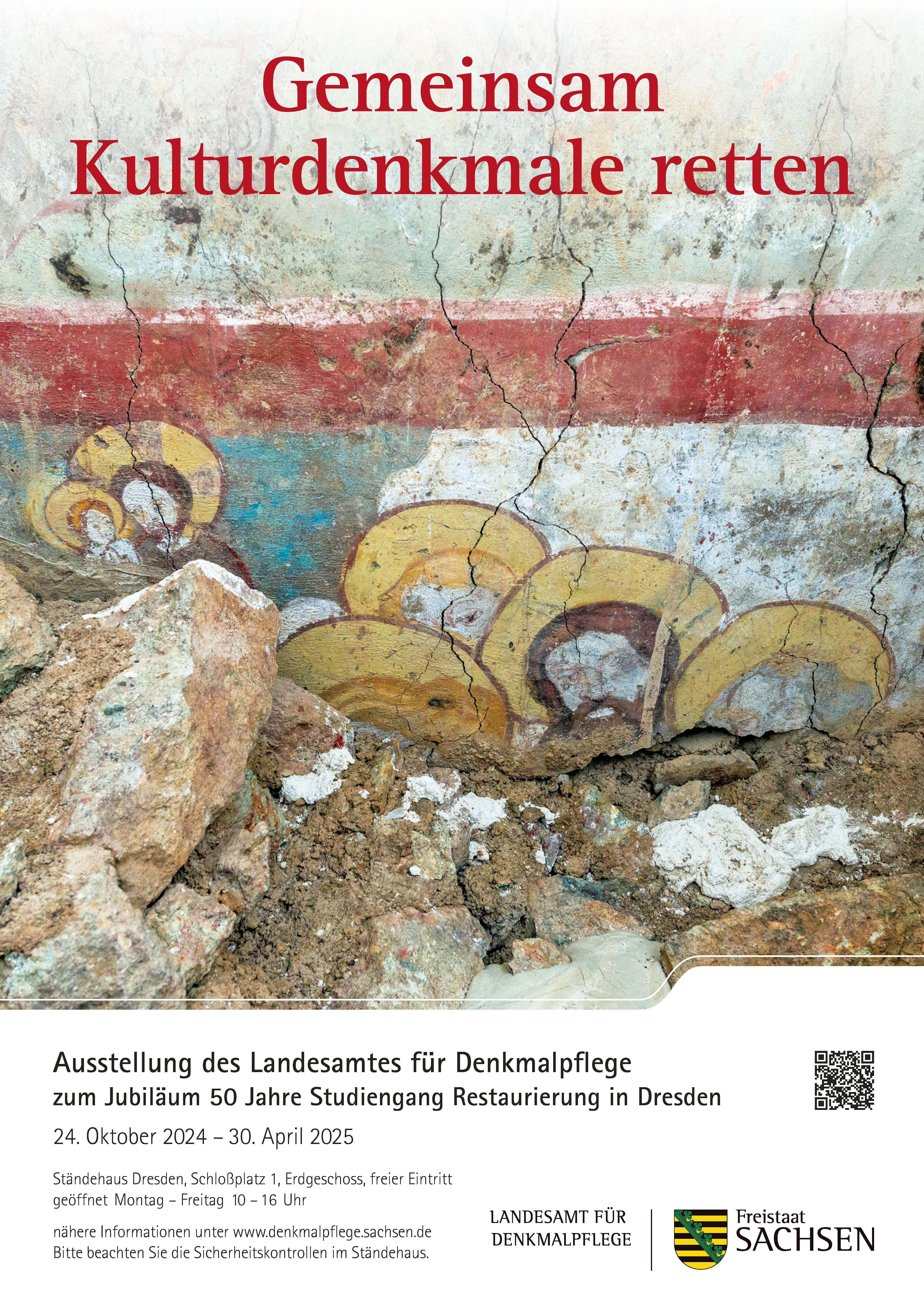 Das Landesamt für Denkmalpflege Sachsen (LfD) rückt in seiner diesjährigen Ausstellung die Restaurierung von Kulturdenkmalen ins Rampenlicht, um das 50-jährige Bestehen des Studiengangs Restaurierung an der Hochschule für Bildende Künste Dresden zu feiern. Als älteste akademische Ausbildungsstätte für Restauratoren in Deutschland pflegt die Hochschule von Anfang an eine enge Verbindung zur sächsischen Denkmalpflege. Bereits ab 1904 unterhielt die Königlich Sächsische Kommission zur Erhaltung der Kunstdenkmäler, das spätere LfD, eine eigene Restaurierungswerkstatt. Der Gründungsprofessor Dr. Ingo Sandner wechselte 1974 vom damaligen Institut für Denkmalpflege, Arbeitsstelle Dresden, an die Hochschule für Bildende Künste, gefolgt von Dr. Andreas Schulze, der nach Jahren im LfD ebenfalls als Professor dorthin zurückkehrte.