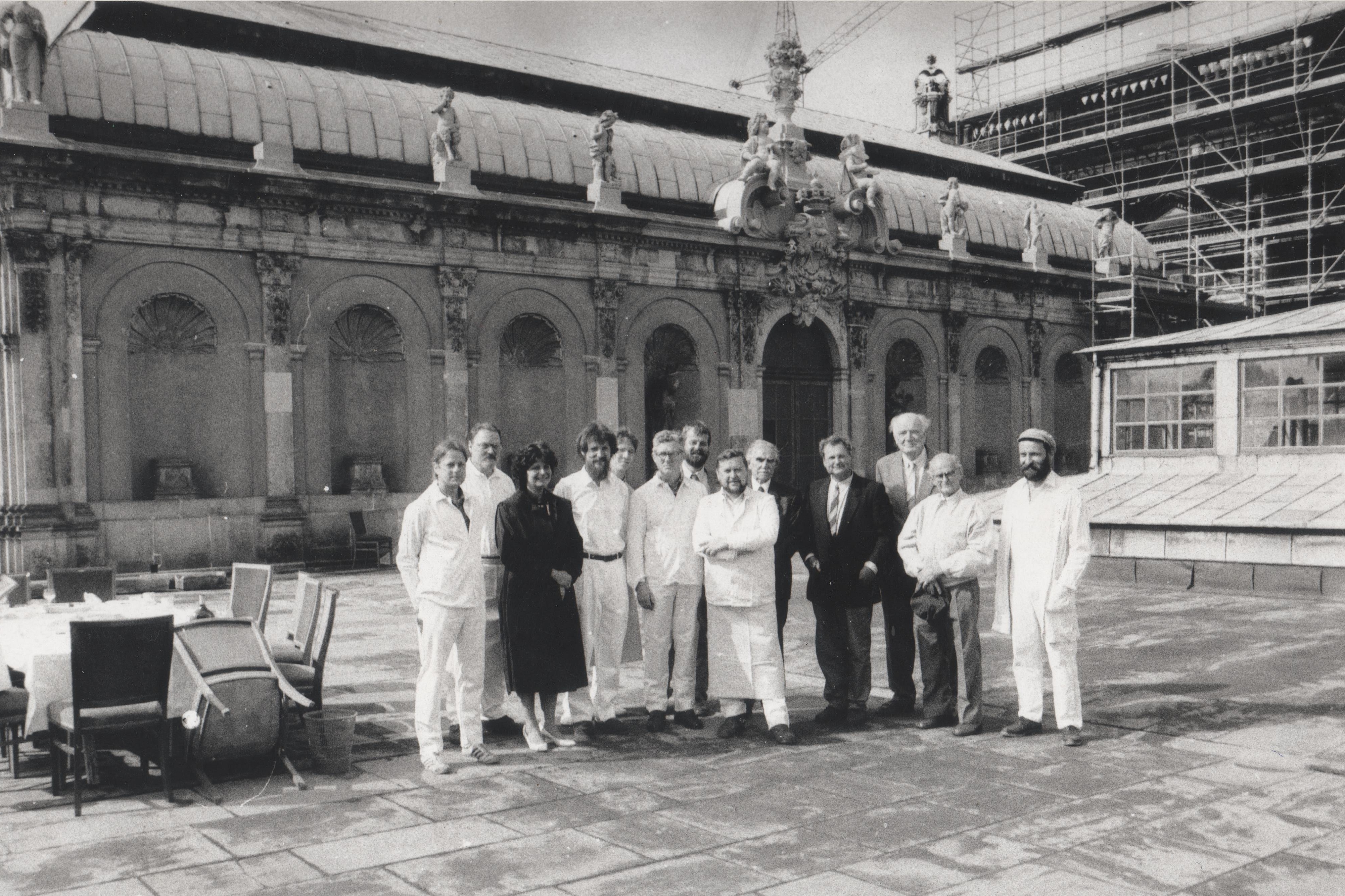 - Das Team der Zwingerbauhütte (ZBH) am 18. Juni 1991 zur offiziellen der Wiedereinrichtung der Bauhütte. (JPG; 2 MB)