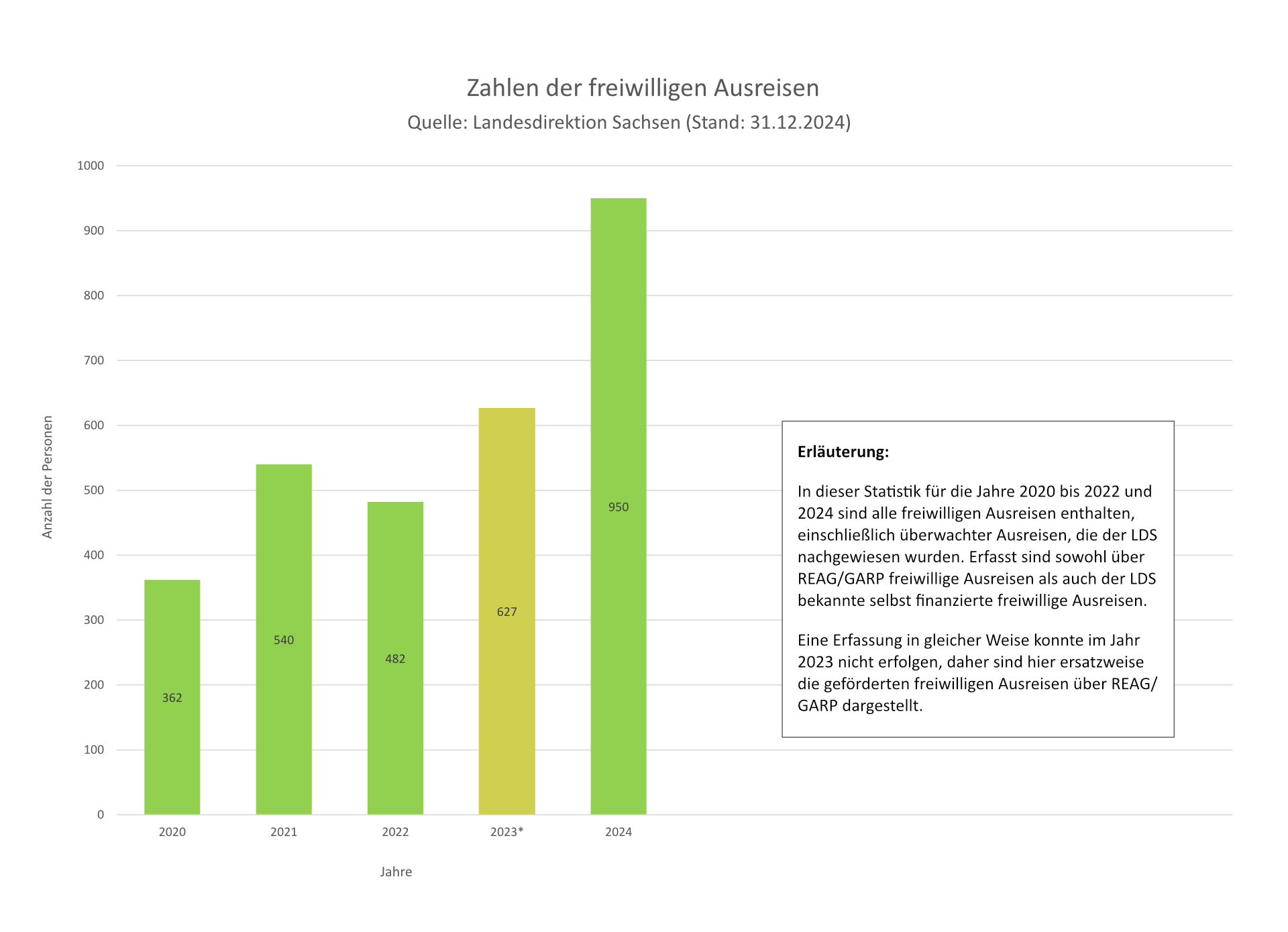 Darüber hinaus stieg die Zahl der nachgewiesenen freiwilligen Ausreisen von 627 Personen in 2023 auf 950 Personen in 2024.