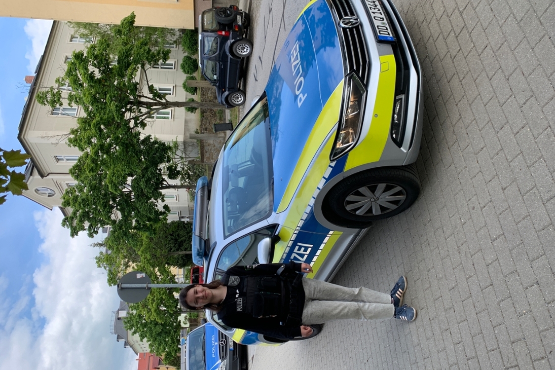 Anlage: Foto von Ayleen vor dem Streifenwagen (al)