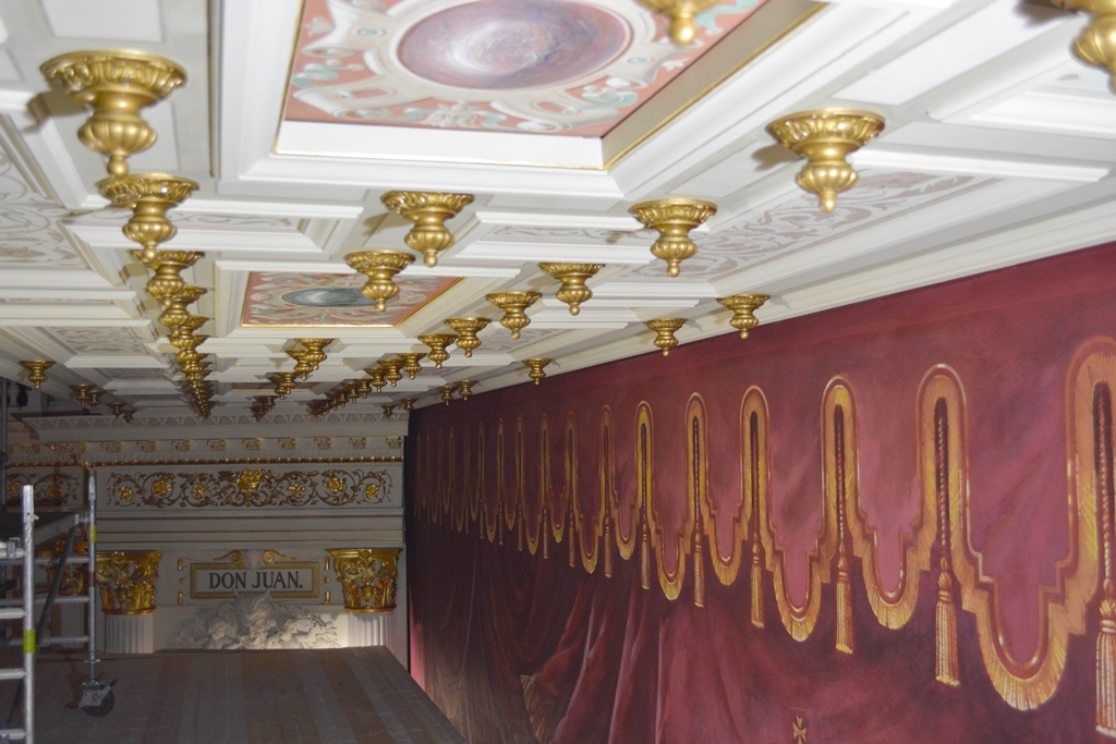 Zur Durchführung der umfangreichen Arbeiten stand nur ein kleines Zeitfenster während der Spielzeitpause zur Verfügung. Zum Leistungsumfang zählten die aufwändige Gerüstaufstellung, intensive Reinigungs-, Konservierungs- und Restaurierungsarbeiten an der Leimfarbenfassung des Harlekinvorhangs, dem Bühnenportal (Untersicht und Vorderseite mit „Fünf-Minuten-Uhr“) und dem Proszeniumsgemälde (Rauchabzugsklappe). Bereiche mit Bindemittelverlusten wurden gefestigt und konserviert, Risse und Ausbrüche konservatorisch bearbeitet sowie retuschiert, Fehlstellen erhielten Ergänzungen. Lose aufliegende Verschmutzungen an der unmittelbaren Umgebungsarchitektur im Zuschauerraum wurden abgenommen sowie Vergoldungen und Bronzierungen gereinigt und restauriert. Die restauratorischen Leistungen teilten sich vier Restauratoren.