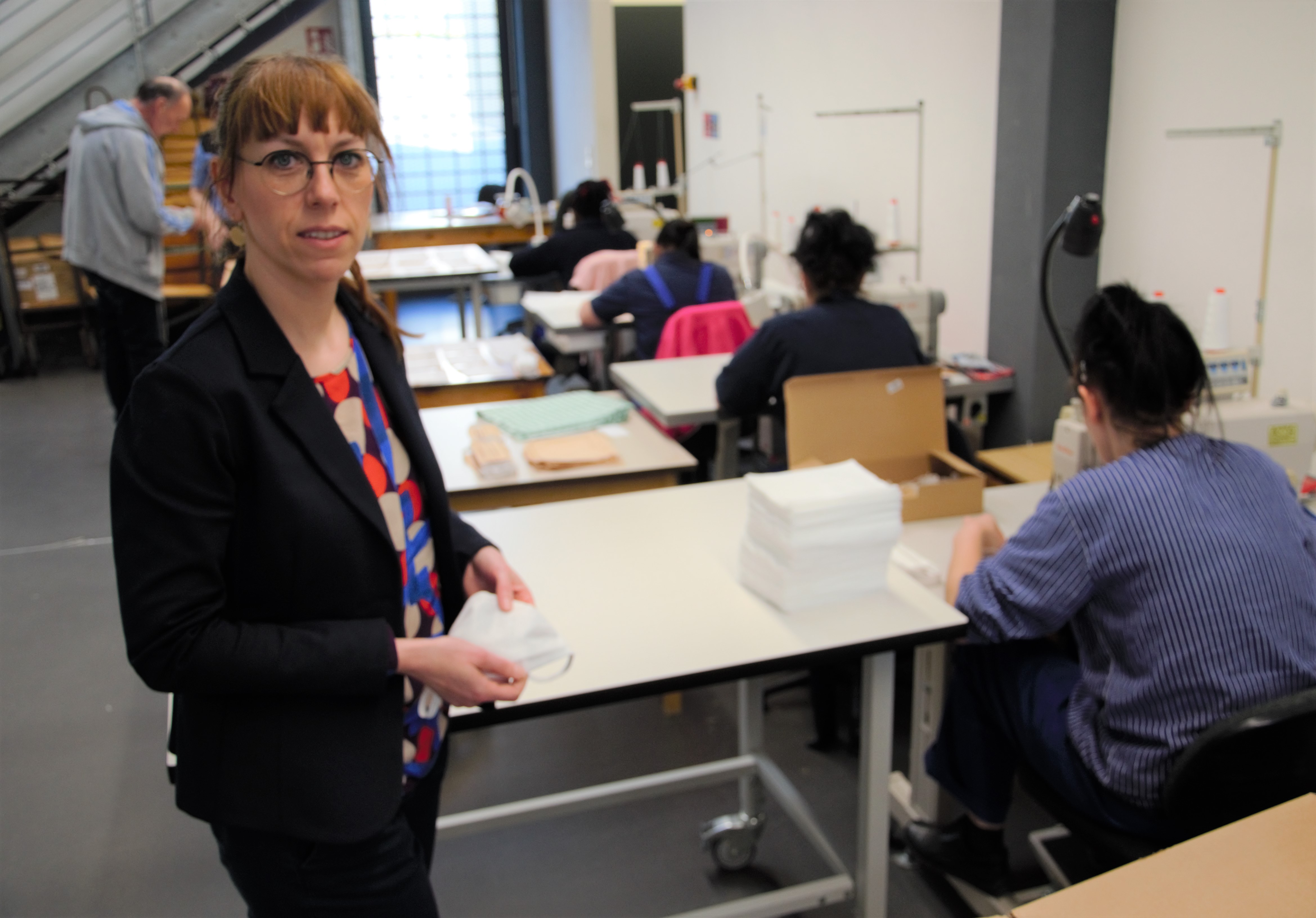 Heute hat Justizministerin Katja Meier die Näherei der Justizvollzugsanstalt Chemnitz besucht und allen Bediensteten und Gefangenen ihren Dank für die Herstellung von Schutzmasken ausgesprochen. In den Arbeitsbetrieben der Justizvollzugsanstalten Chemnitz und Torgau werden durch Gefangene unter Anleitung von Bediensteten Schutzmasken für das Deutsche Rote Kreuz, das Polizeiverwaltungsamt und für den eigenen Bedarf der sächsischen Justizvollzugsanstalten genäht.