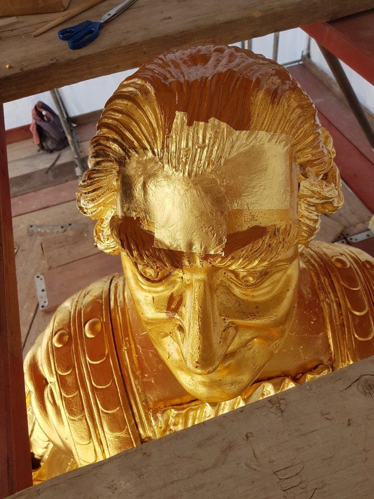- [Foto] Dresden, Restaurierung des Goldenen Reiters, Detail vom Kopf des Kurfürsten, bereits angelegte Neuvergoldung auf neuer Grundierung, 2020 (Quelle: LfD Sachsen)