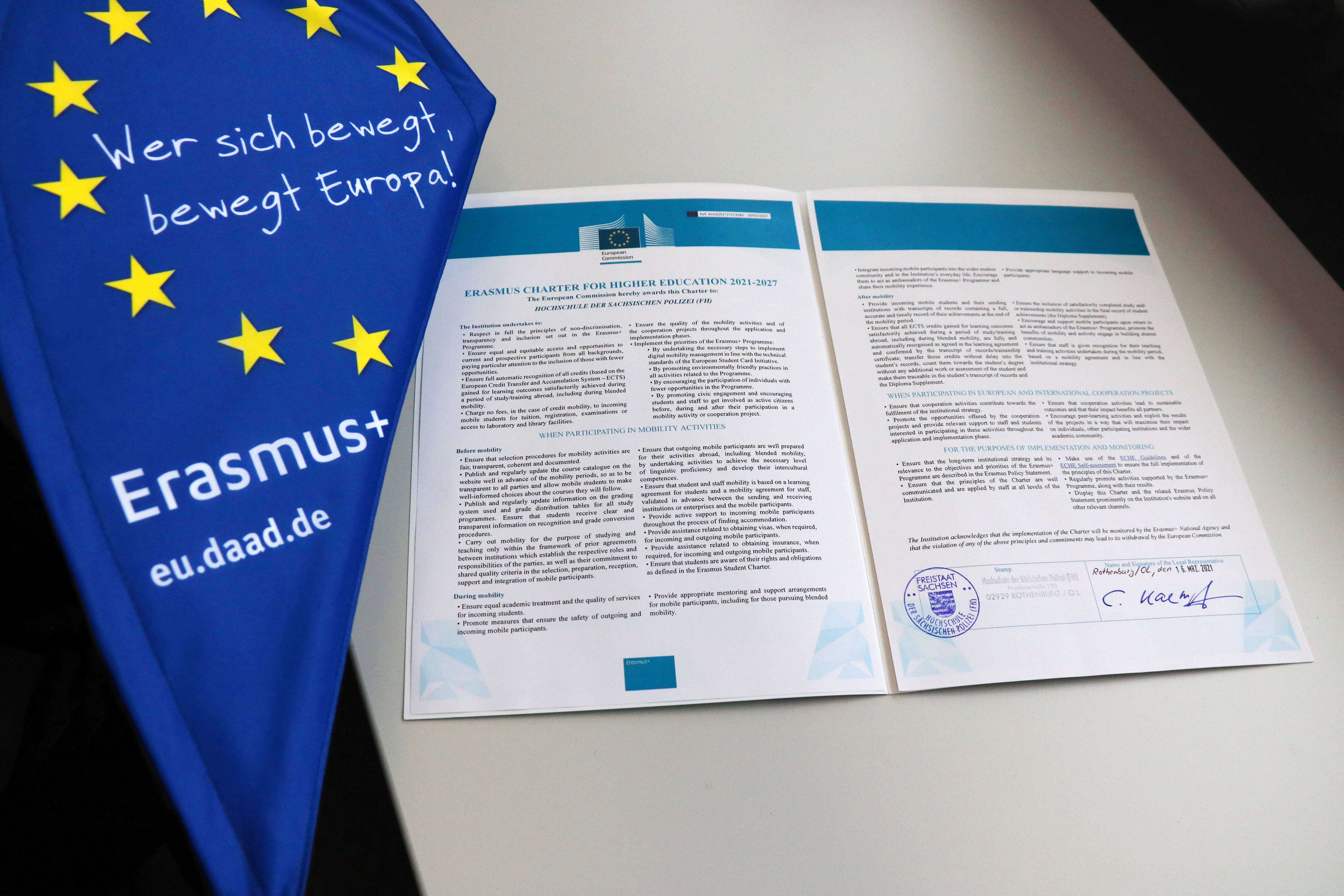 Den Zielstellungen der Europäischen Union sowie die ERASMUS+ Projektkonzepte sind gemeinsam mit dem unterzeichneten Schmuckblatt des neuen ECHE-Qualitätssiegels auf der Internetseite der Hochschule der Sächsischen Polizei (FH) zu finden.