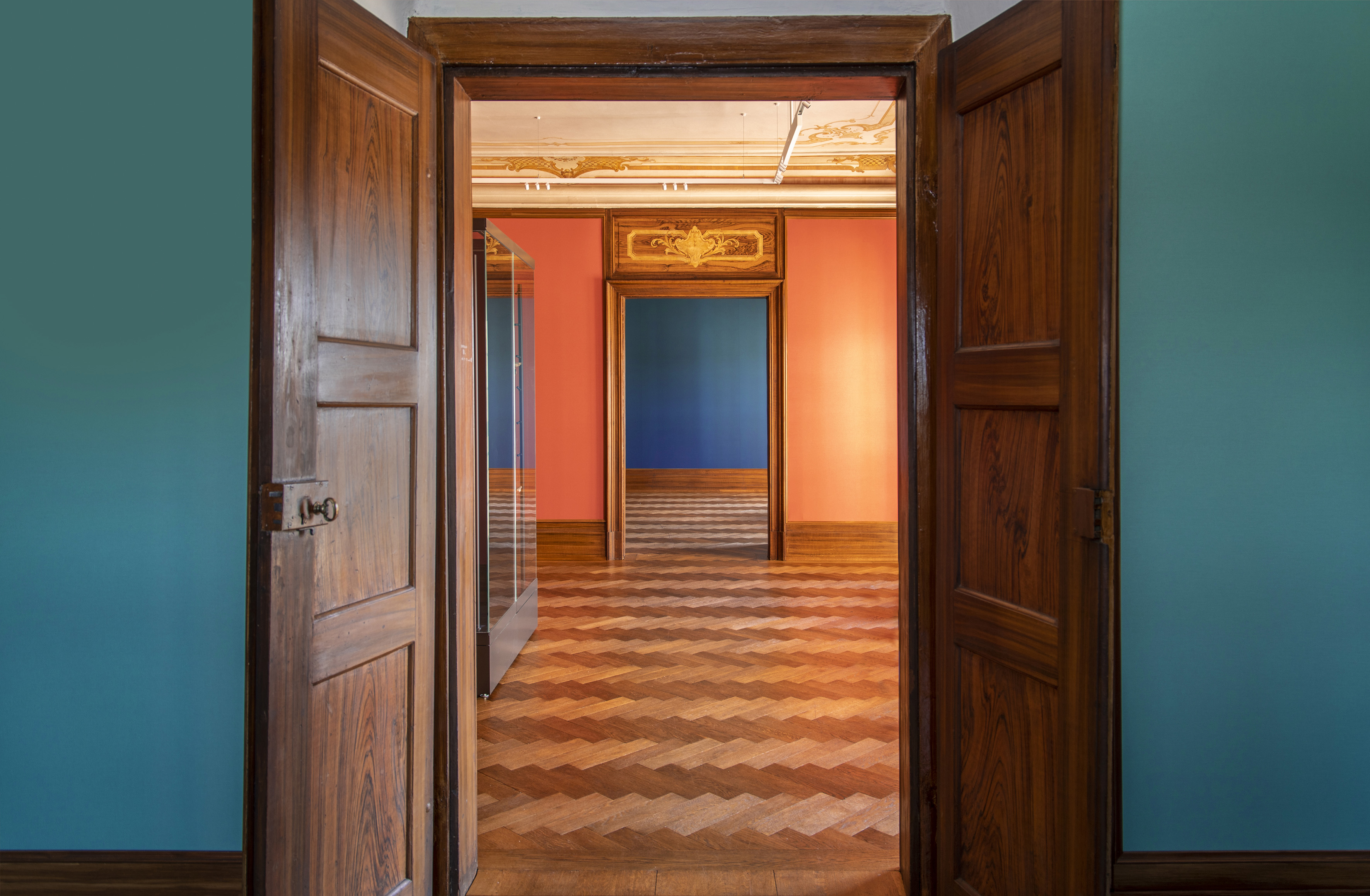 Um eine flexible Ausstellungsgestaltung zuzulassen, wurde gemeinsam mit dem Schlossbetrieb nach aufwendigen Bemusterungen von Stoffen entschieden, dass die Wände mit farblich unterschiedlichen textilen Wandbespannungen ausgestattet werden. So gibt es jetzt einen blauen, einen roten, einen beigen und zwei grüne Salons. Eine besondere Herausforderung für die Restauratoren waren die neobarocken Deckenmalereien, da es sich hier um eine schwer zu konservierende Öl-Wachs-Malerei handelt. Die Malereien wurden gereinigt, konserviert und die Fehlstellen behutsam und zurückhaltend retuschiert. Das historische Parkett wurde geborgen, restauriert und abschließend wieder eingebaut. Die beiden Fayence-Öfen aus dem frühen 18. Jahrhunderts wurden abgebaut, restauriert und nach dem Verlegen des Parketts wieder aufgestellt. Ein Ofen bekommt seinen Vasenaufsatz aus den Schloss-Beständen wieder. Der dritte Ofen, vermutlich aus der Mitte des 19. Jahrhunderts, konnte vor Ort restauriert werden.