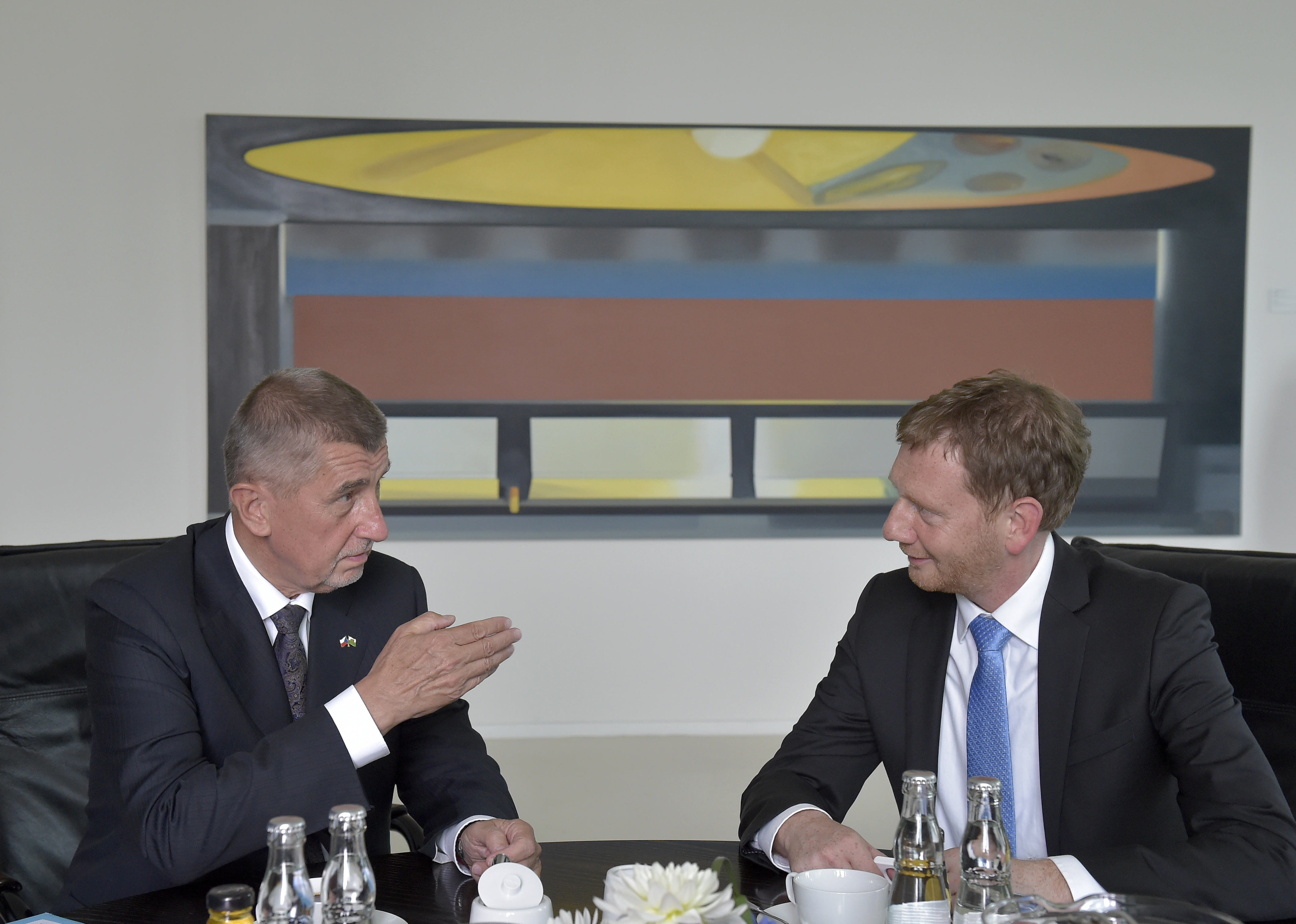 Ministerpräsident Michael Kretschmer (r) spricht am 11. Juni 2018 mit dem Premierminister der Tschechischen Republik, Andrej Babiš (l.), in der Sächsischen Staatskanzlei in Dresden.