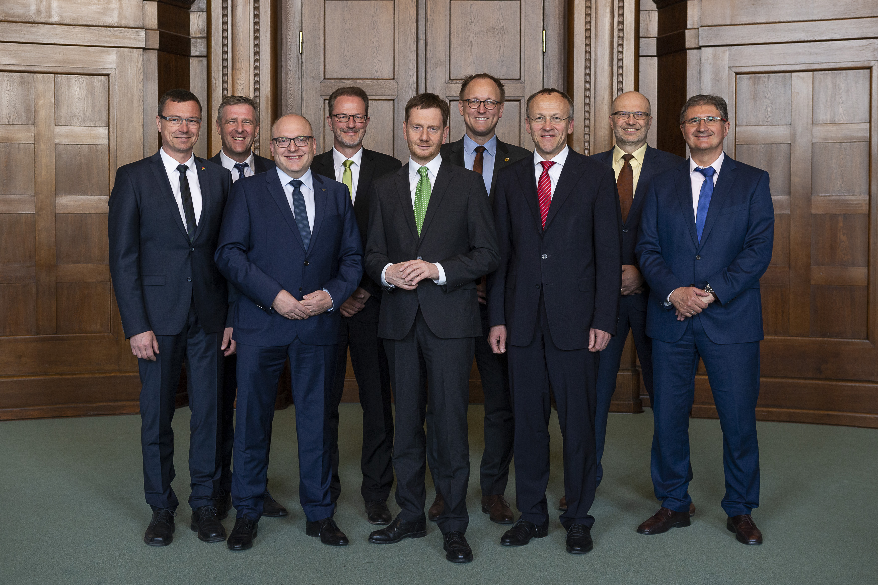v.l. - Ralf Rother, Verbandsvorsitzender KISA, Andre Jacob, GF Sächs. Landkreistag, Sven Schulze, BM Chemnitz, Mischa Woitscheck, GF SSG, Ministerpräsident Kretschmer, Ulrich Hörning, BM Leipzig, Dr. Peter Lames, BM Dresden, Thomas Weber, Direktor SAKD, Thomas Popp, Amtschef/CIO, vor dem Spitzengespräch 'Digitale Verwaltung Sachsen'