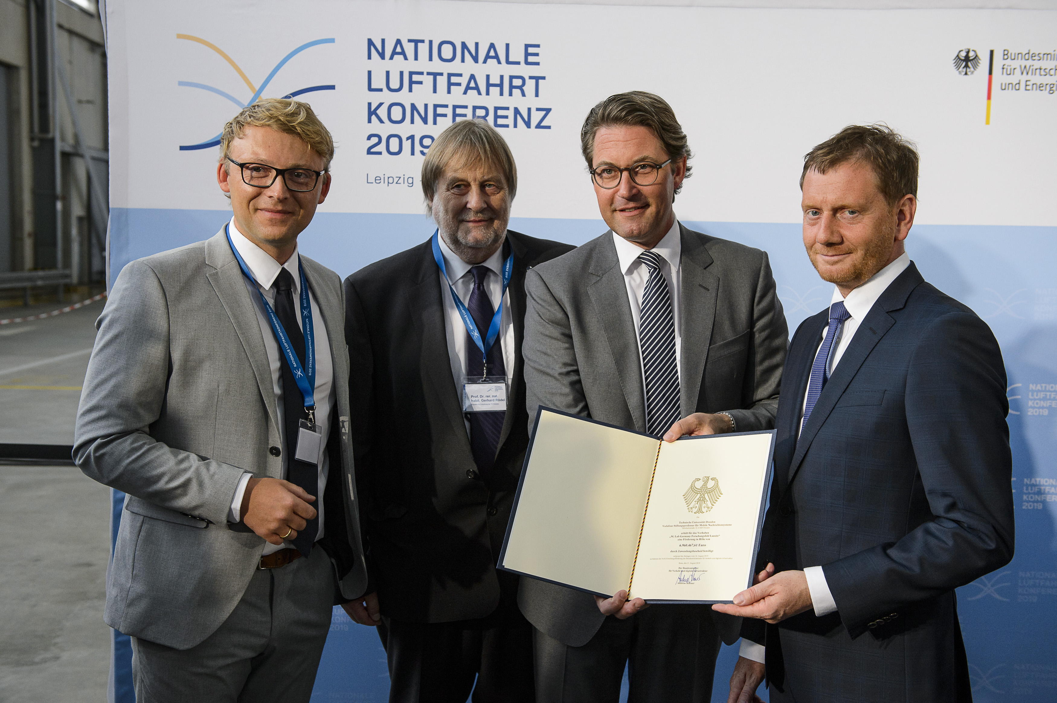 Bundesverkehrsminister Andreas Scheuer (3.v.l) überreicht einen Zuwendungsbescheid über 6.960.467,61 Millionen € an Gerhard Rödel (2.v.l.), Prorektor für Forschung TU Dresden und Norman Franchi, Geschäftsführer 5G Lab GmbH, Ministerpräsident Michael Kretschmer (r) am Rande der ersten Nationalen Luftfahrtkonferenz auf dem Flughafen Leipzig-Halle. Gefördert werden soll der Aufbau eines 5G-Testfeldes in der Lausitz, aufgenommen 21.08.2019