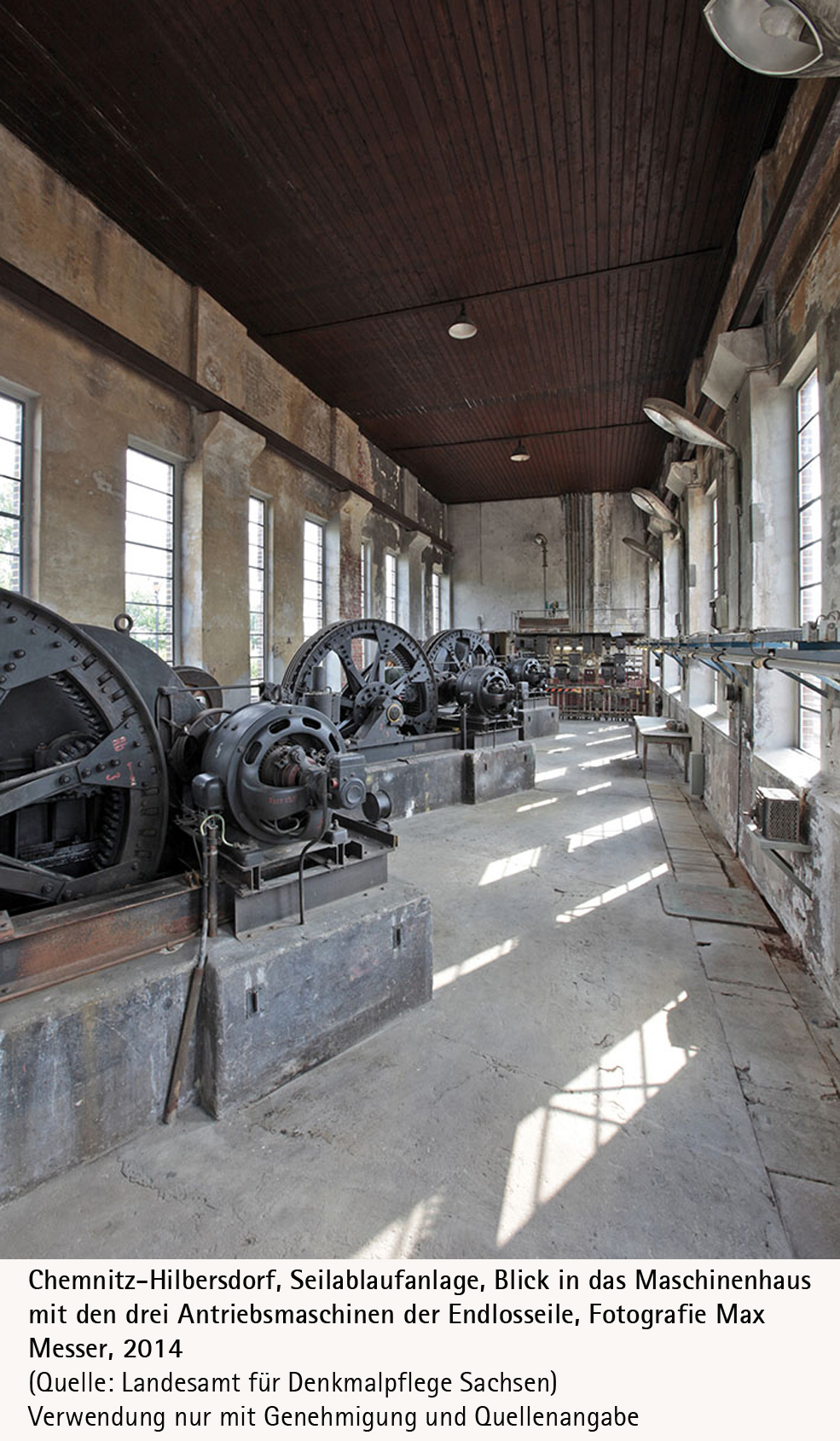 Foto: Chemnitz-Hilbersdorf, Seilablaufanlage, Blick in das Maschinenhaus mit den drei An-triebsmaschinen der Endlosseile, Fotografie Max Messer, 2014 (Quelle: LfD Sachsen)