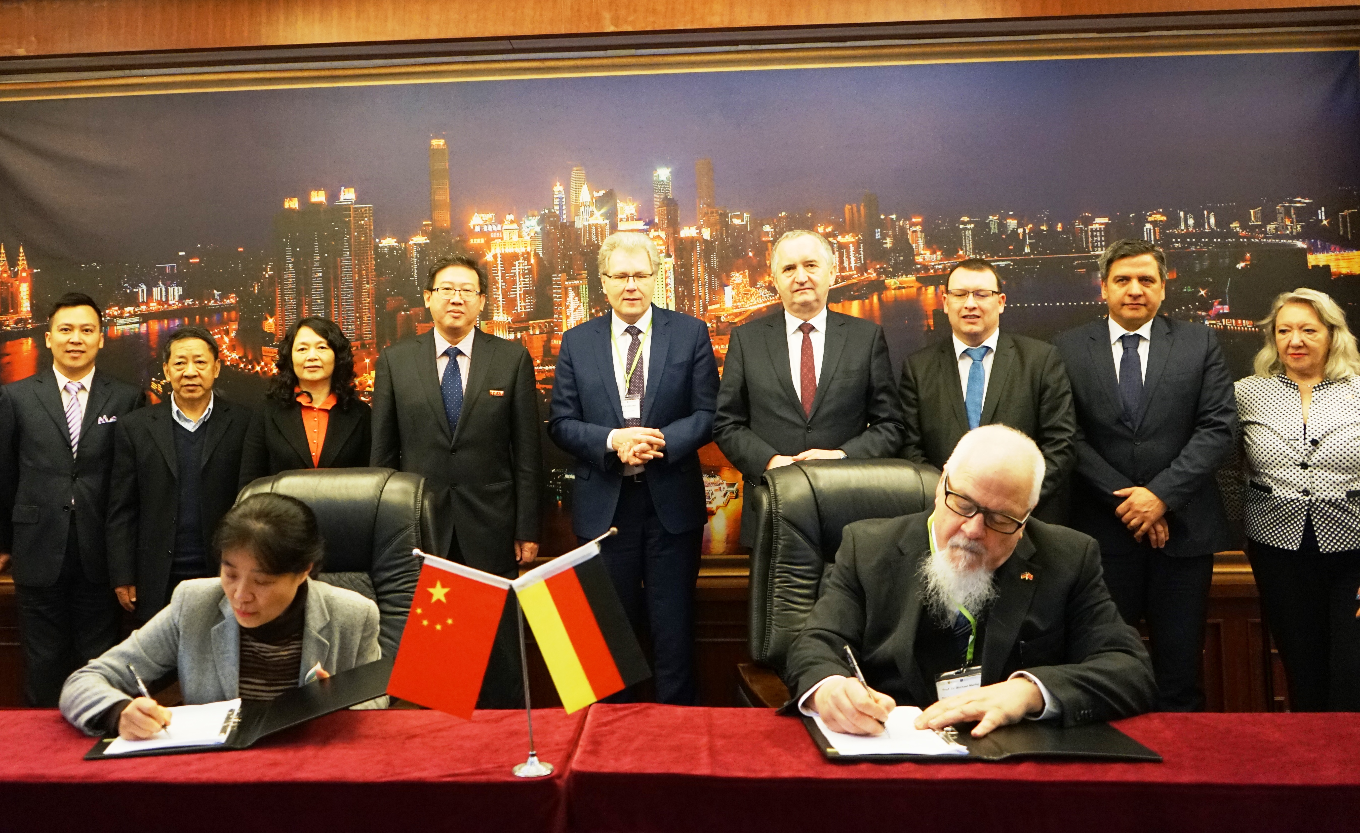 Unterzeichnung der Kooperationsvereinbarung durch Prof. Michael Mertig und Frau Prof. Yi Xu. Hinten von rechts: Generalkonsulin Ingrid Delfs, Lutz Richter MdL, Ronny Wähner MdL, Staatsminister Schmidt, Knut Schmidtke (HTW Dresden), Vizepräsident der Universität Chongqing Ju Ming, Abteilungsleiterin Yongcai Guo, Prof. Zhiyu Wen, Liang Ao (Akademie der Umweltwissenschaften)