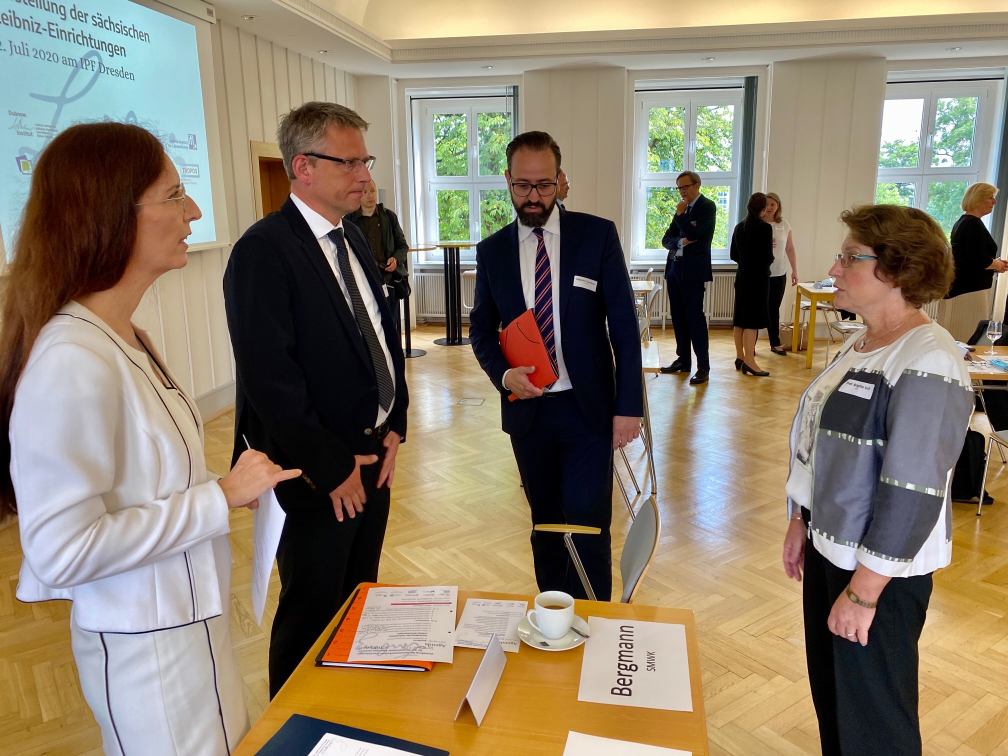 v.l.n.r.: Prof. Dr. Brigitte Voit (wiss. Direktorin IPF DD) Wissenschaftsminister Sebastian Gemkow, Axel Bergmann (Referatsleiter SMWK), Dr. med. Lilla Farkas (kaufm. Direktorin IPF DD) (© @SMWK)