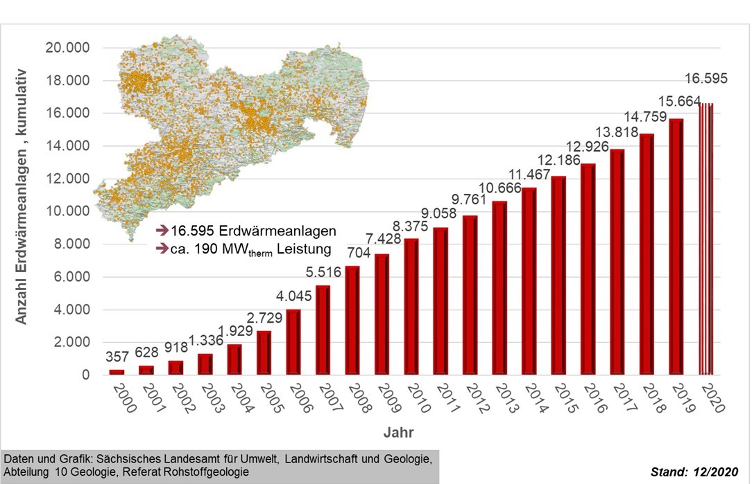Die Grafik zeigt den Zuwachs an Erdwärmeanlagen in Sachsen: von 357 im Jahr 2000 auf aktuell 16.595 Anlagen.