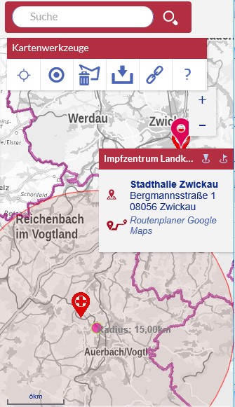 15-Kilometer-Umkreis auf dem Smartphone am Beispiel von Auerbach (© GeoSN)