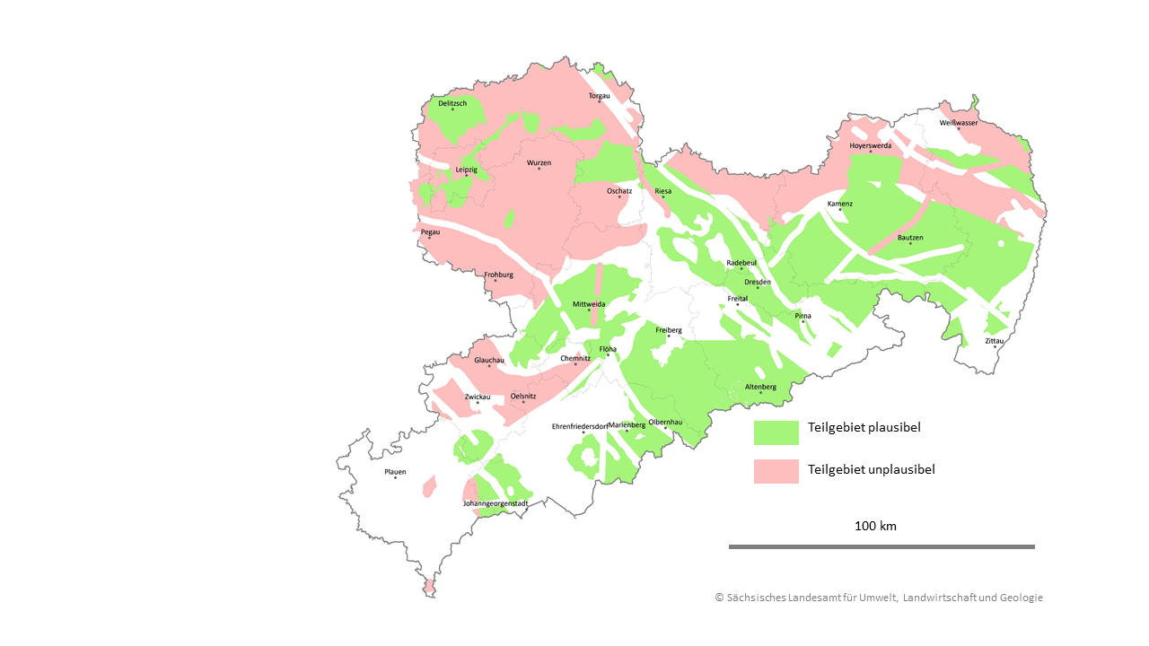 Die Karte zeigt das Ergebnis der Prüfung des „Zwischenberichts Teilgebiete gemäß § 13 Standortauswahlgesetz" durch das LfULG: Grüne Flächen zeigen Regionen, in denen die Ausweisung als Teilgebiet fachlich plausibel ist. Rosa Flächen zeigen Regionen, in denen die Ausweisung als Teilgebiet fachlich unplausibel ist.