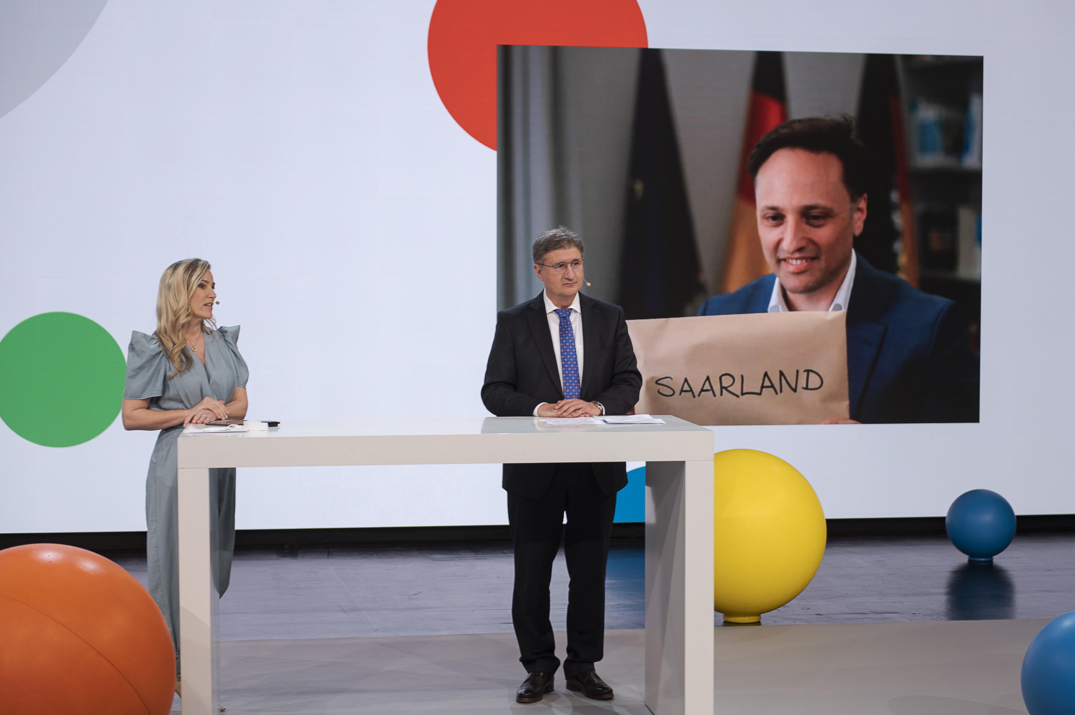 Christiane Stein, Moderatorin, Thomas Popp, Staatssekretär für Digitale Verwaltung und Verwaltungsmodernisierung, aufgenommen während des 9. Fachkongresses des IT-Planungsrates in Dresden.