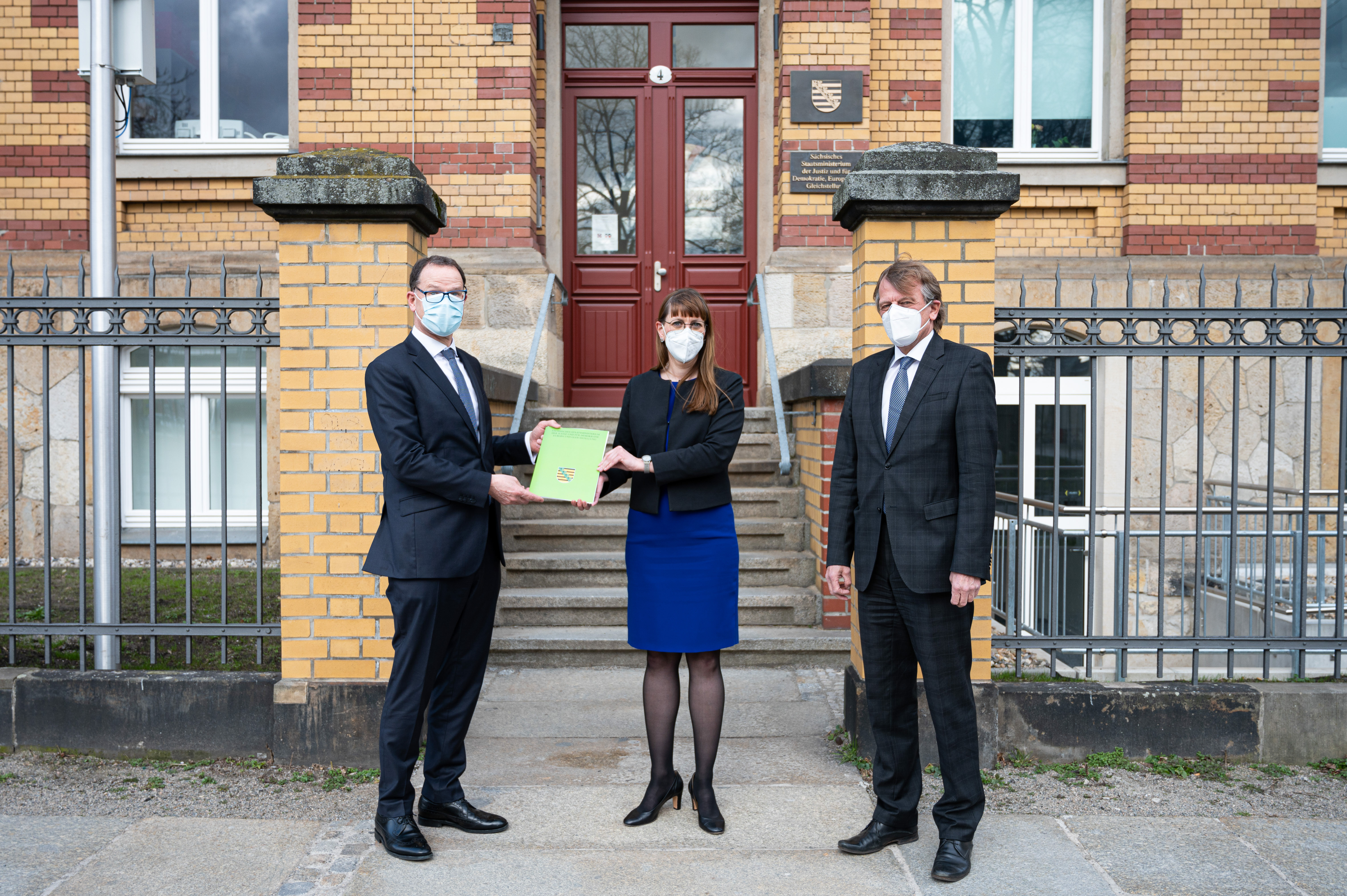 Foto: Urkundenübergabe mit Staatsministerin Katja Meier, Dirk Eberhard Kirst (links) und Dr. Michael Gockel (rechts)