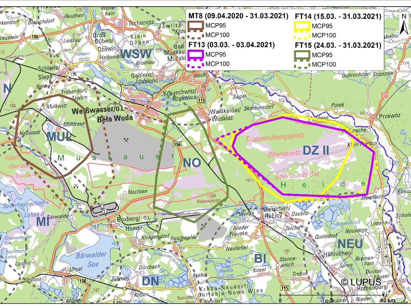 Bezeichnung der Wölfe: FT13 = "Cora", FT14 = "Rona", FT15 = "Lea", MT8 = "Peter"; Abkürzung der Wolfsterritorien: MUL = Mulkwitz, NO = Nochten, DZ II = Daubitz II; MCP95 = 95 Prozent der genutzten Fläche, MCP100 = 100 Prozent der genutzten Fläche
