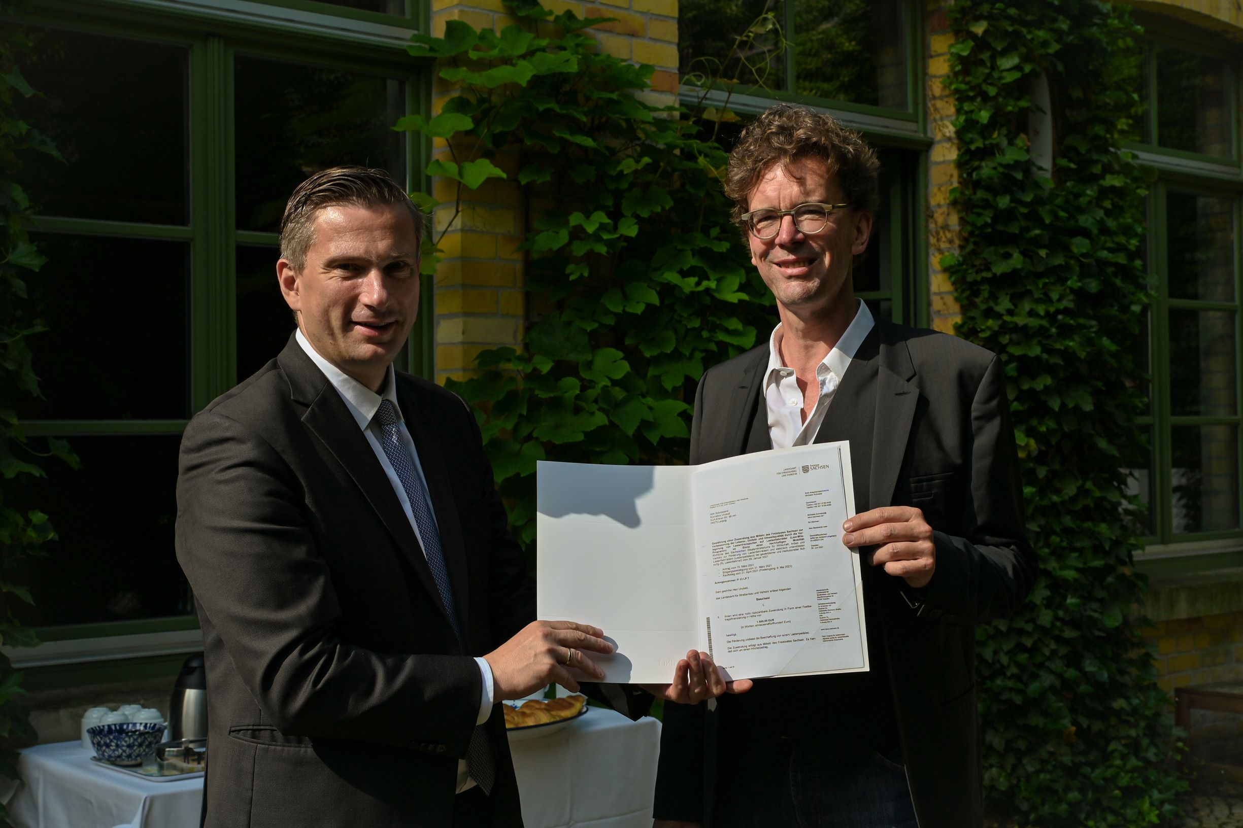 Verkehrsminister Martin Dulig überreicht heute einen Förderbescheid für ein Lastenpedelec in Höhe von 1.500 Euro an Kornelius Unckell, Inhaber der Alten Schlosserei in Leipzig.