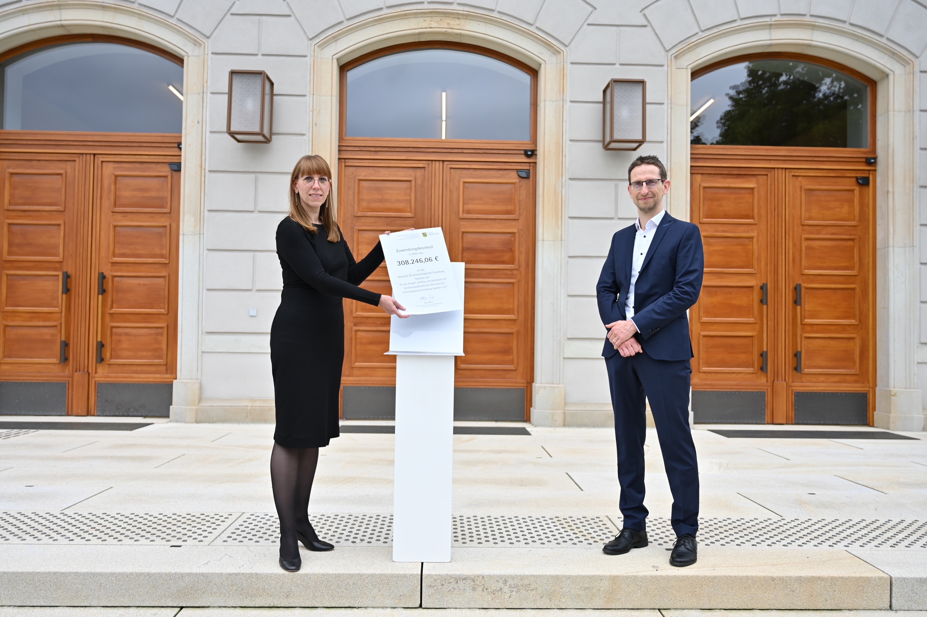 Justizministerin Katja Meier übergibt den Zuwendungsbescheid an Prof. Dr. Frank Asbrock, Direktor des Zentrums für kriminologische Forschung Sachsen