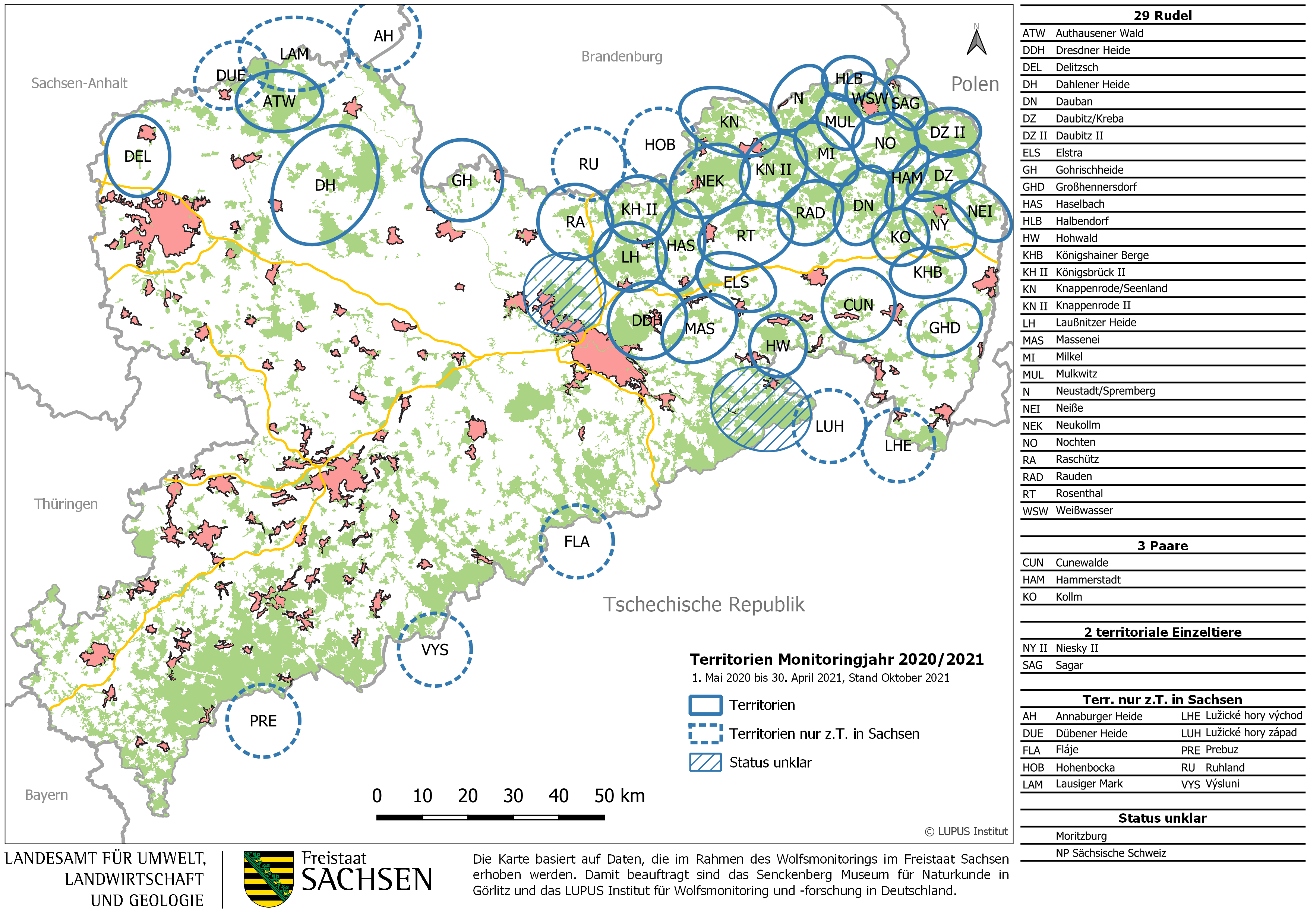Die Karte basiert auf Daten, die im Rahmen des Wolfsmonitorings im Freistaat Sachsen für das Monitoringjahr 2020/2021 erhoben wurden. Damit beauftragt sind das Senckenberg Museum für Naturkunde in Görlitz und das LUPUS Institut für Wolfsmonitoring und - forschung in Deutschland. Das Monitoringjahr 2020/2021 umfasst den Zeitraum vom 1. Mai 2020 bis zum 30. April 2021.