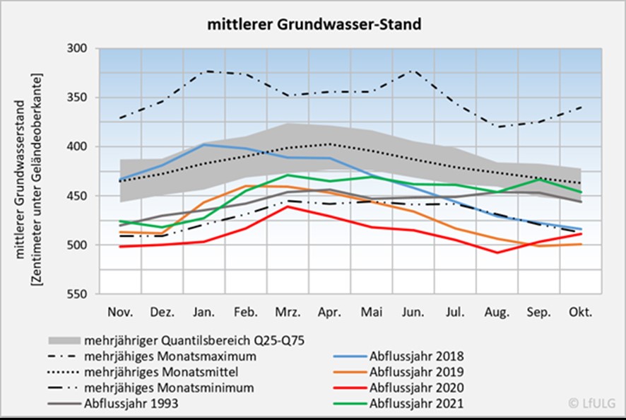 Die Grafik zeigt die Monatswerte von Grundwasserständen in ganz Sachsen im mehrjährigen Mittel von 1970 bis 2017 (grauer Bereich und schwarze Linien) im Vergleich zu den Jahren 2018, 2019, 2020 und 2021. Das Abflussjahr beginnt am 01.11. des Vorjahres und endet am 31.10. des Jahres. Datenauswahl: ca. 100 repräsentative Messstellen, vereinzelt Fehljahre, Auswertezeitraum 1970 bis 2021.