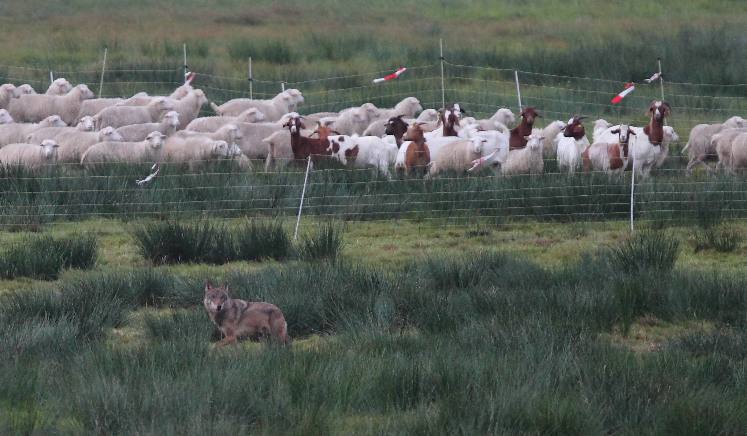 Foto: Wolf läuft entlang einer Koppel mit Weidetieren hinter Elektrozaun