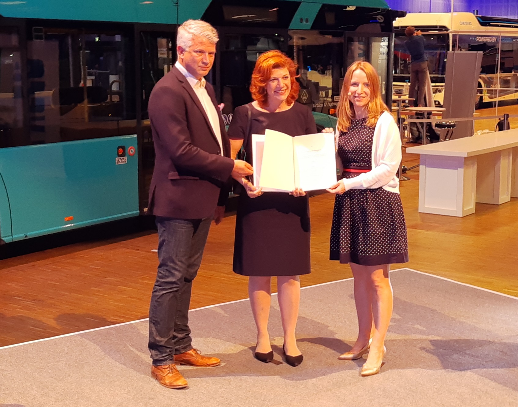 Übergabe des Fördermittelbescheides an die Stadtrundfahrt Dresden GmbH am 11.07.2022 in Berlin Von links: Andreas Kund & Bettina Blank (Stadtrundfahrt Dresden GmbH), Daniela Kluckert (Parlamentarische Staatssekretärin im BMDV)