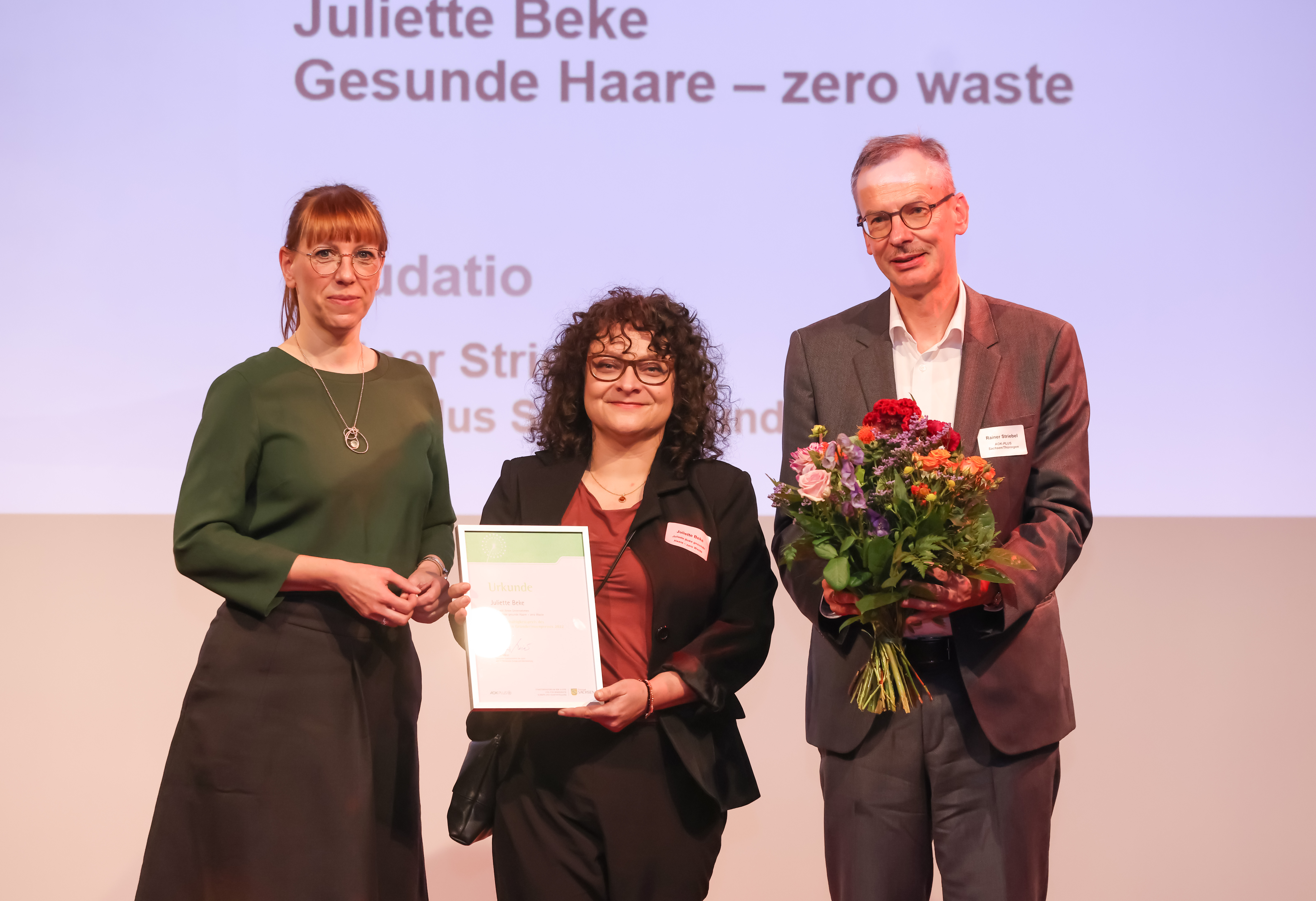 v.l.: Staatsministerin Katja Meier, Juliette Beke, Rainer Striebel (AOK-PLUS Sachsen und Thüringen)