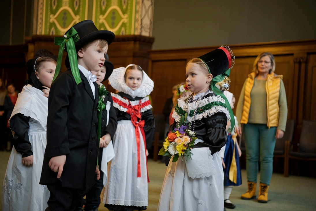 Anlässlich der traditionellen Vogelhochzeit begrüßte Ministerpräsident Michael Kretschmer Kinder aus der Witaj-Kindertagesstätte »K wódnemu mužej« Malešecy/Malschwitz in der Staatskanzlei. Die Kinder zeigten, wie das Fest der Vogelhochzeit (sorbisch: ptači kwas) in der sorbischen Oberlausitz begangen wird. Zu diesem Brauch finden in sorbischen Kindergärten liebevoll gestaltete Umzüge statt. Dabei tragen die Kinder sorbische Hochzeitstrachten oder verkleiden sich als Vögel.