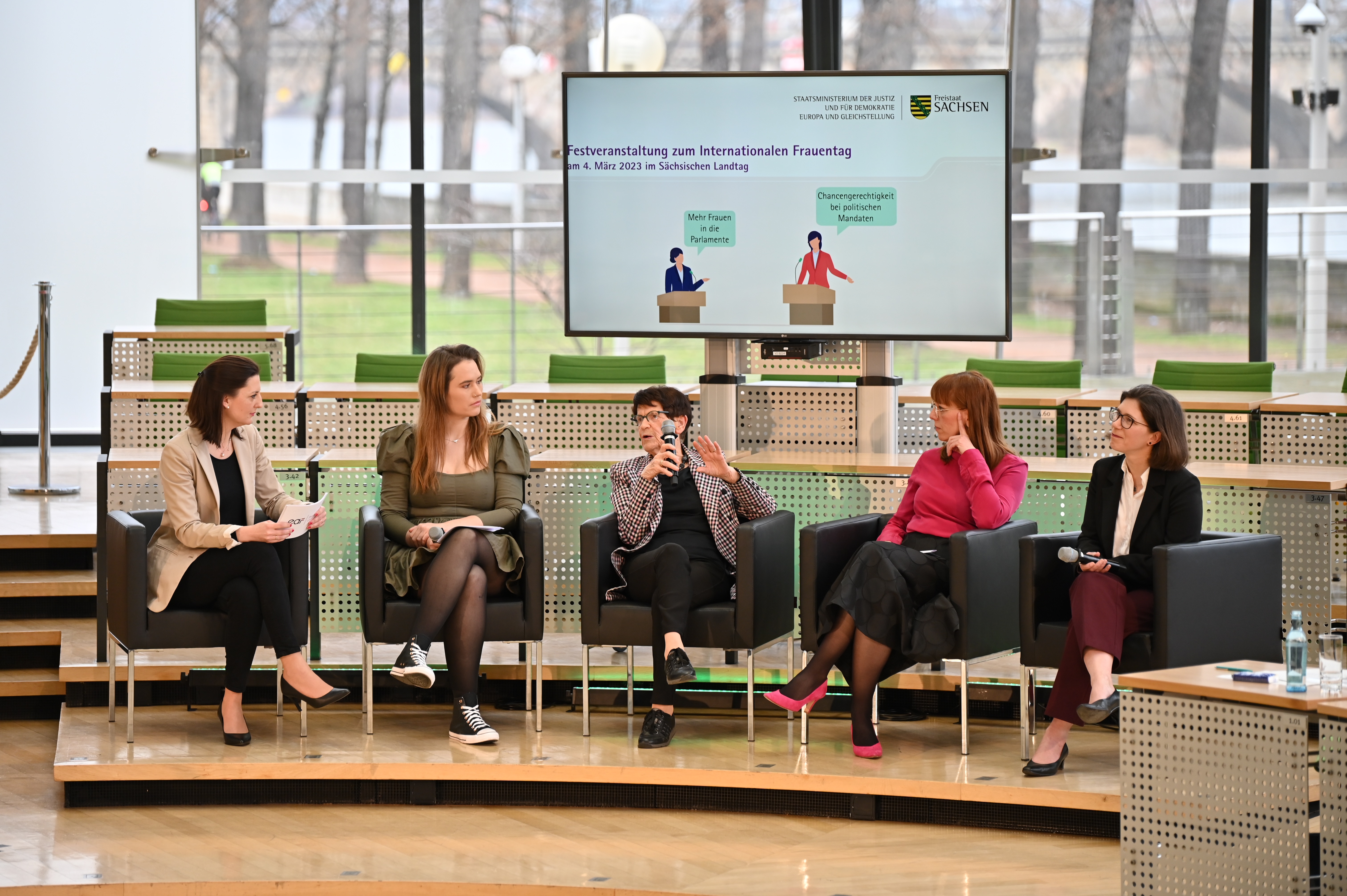 Gleichstellungsministerin Katja Meier auf dem Podium mit Bundestagspräsidentin a.D. Prof. Dr. Rita Süssmuth, mit der Oberbürgermeisterin der Stadt Niesky, Kathrin Uhlemann sowie mit Spoken Word Artist Jessy James LaFleur (© SMJusDEG | Daniel Meißner)
