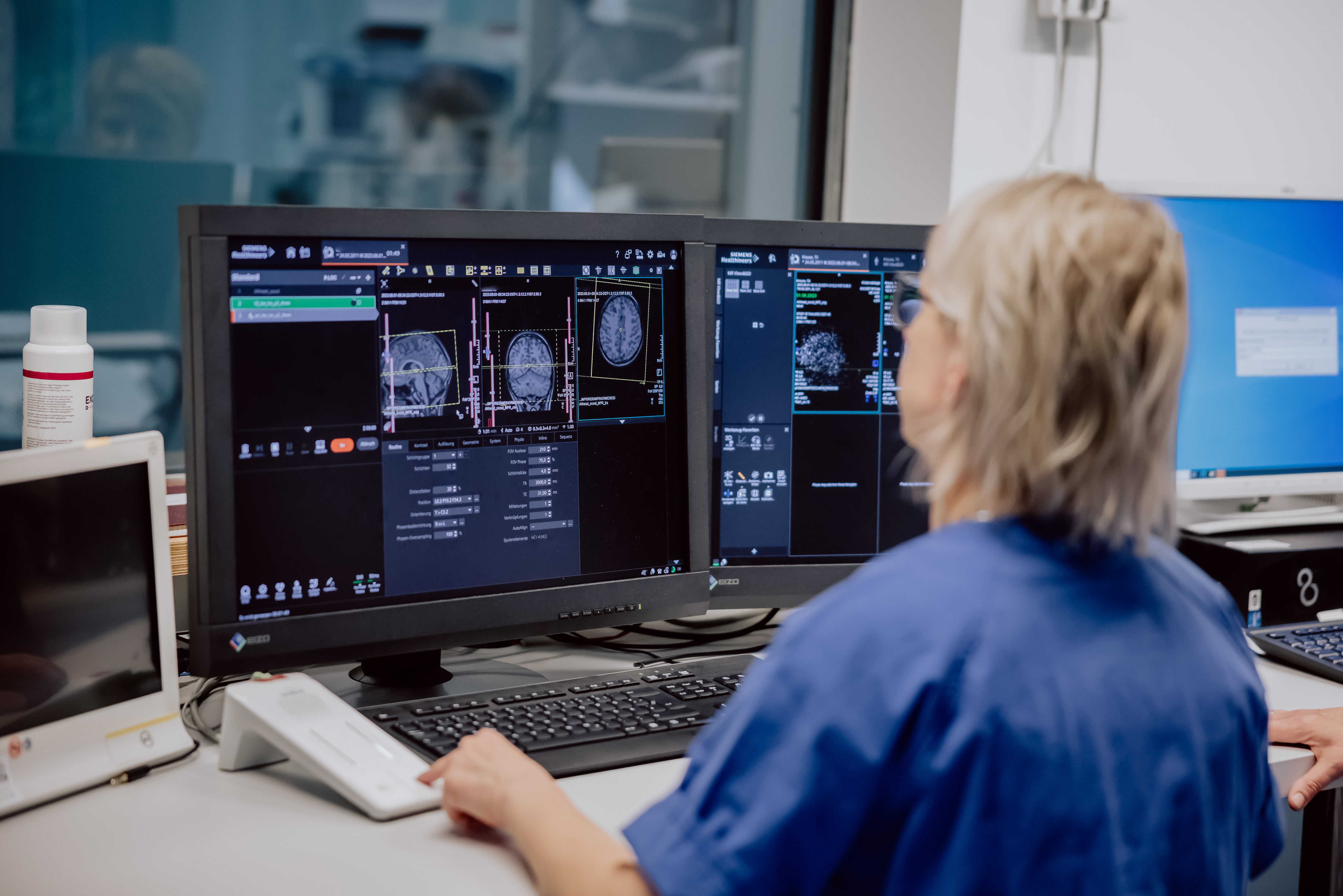 Klinikmitarbeiterin sitzt vor Bildschirmen auf denen Bildaufnahmen zu sehen sind, die mit dem neuen MRT gemacht wurden