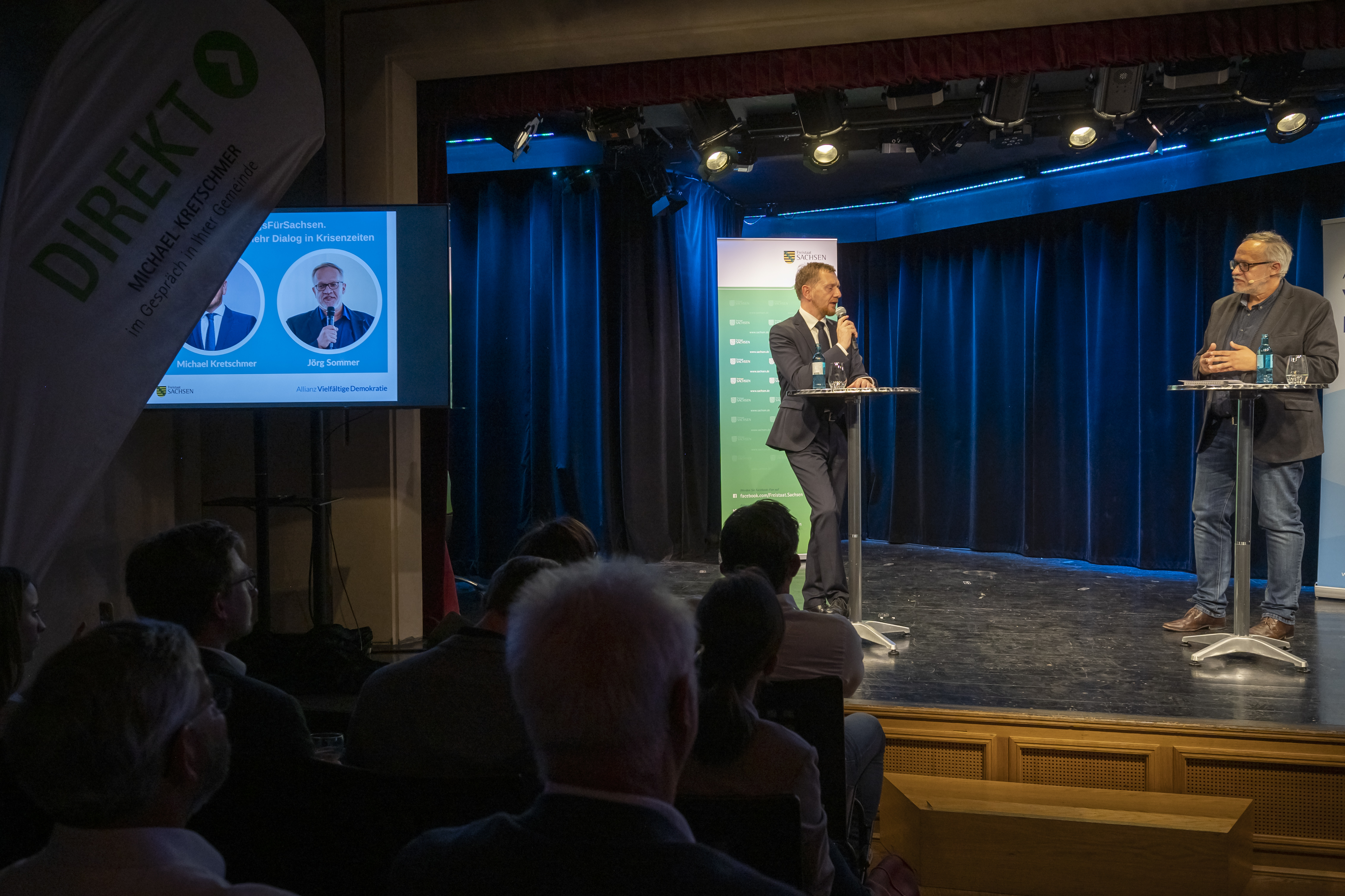 Gespräch »#UnterwegsFürSachsen. Brücken bauen - Mehr Dialog in Krisenzeiten« Ministerpräsident Michael Kretschmer im Gespräch mit Jörg Sommer (Direktor des Berlin Institut für Partizipation) und Diskussion mit dem Publikum